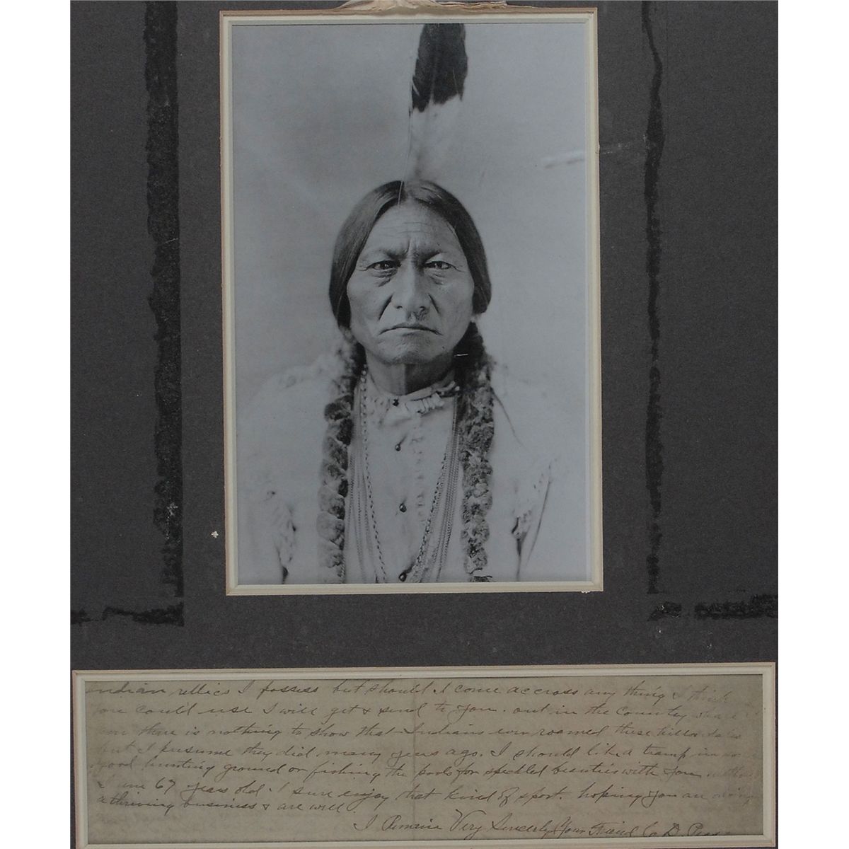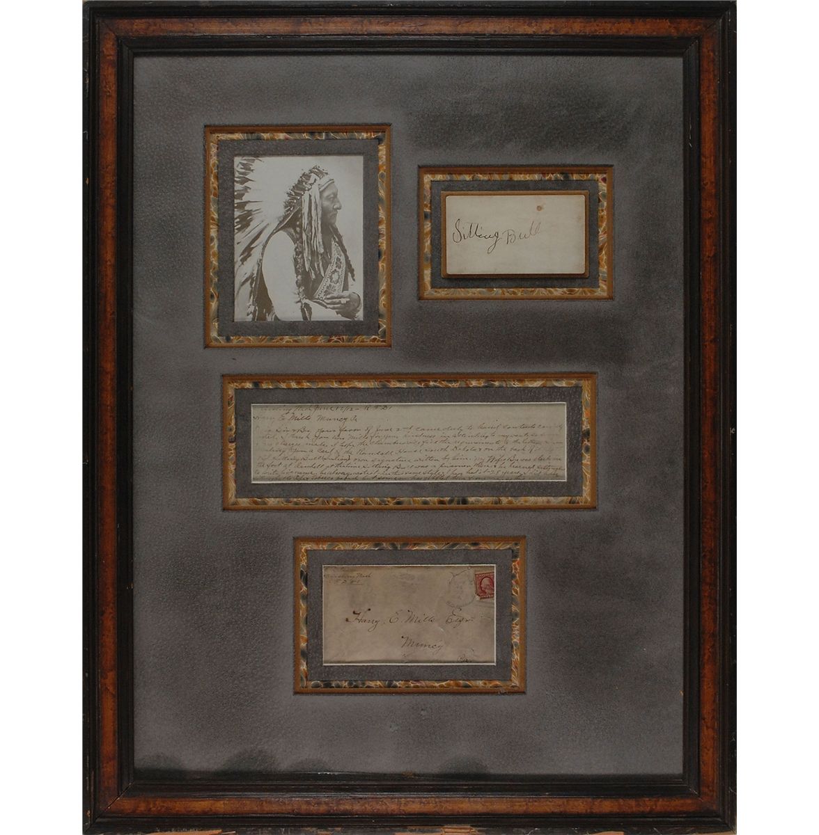 Hunkpapa Lakota Sioux holy man (circa 1831–1890) known for his steadfast opposition to the intrusion of the US government into Sioux lands. Fleeing to Canada following the Battle of Little Big Horn, he later returned to the US and toured with Buffalo Bill’s Wild West Show. Fearing his growing influence, government agents fatally shot him during an arrest attempt at Standing Rock Agency on December 15, 1890. Extremely rare ink signature, “Sitting Bull,” on the reverse of an off-white 4.5 x 2.75 Randall House card. Accompanied by a handwritten letter of provenance from C. D. Pease explaining how he acquired the autograph, one page, both sides, 10 x 3, no date, but the envelope is postmarked June 14, 1912. Letter reads, in part (with grammar and spelling retained): “I am enclosing you a Card of the Randall House South Dakota & on the back of it is Old Sitting Bull (Indians) own signature written by him. My wife’s Bro was clerk in the fort at Randall at the time Sitting Bull was a prisoner there. & he learned Sittingbull to write his name. he always wrote it in this same style. I have had it 28 years. I did have Sittingbull’s Pipe & Tobacco pouch but some on[e] has gobbled them from me.” The signature and the letter are triple-cloth-matted and framed with the original mailing envelope and a portrait of Sitting Bull in an ornate headdress, to an overall size of 21.75 x 27.25. In fine condition, with a small circular stain to upper blank area and a bit of scattered light soiling, not at all affecting the boldness or legibility of the 3.5? long signature. The frame is chipped and the backing is in need of some repair. Also included is a Sherwoods Spirit of America tag, one of America’s leading specialists in Native American artifacts and historic Americana. After Sitting Bull surrendered to federal forces at Fort Buford, he became a living representation of the Indian resistance. During his two years in captivity at Fort Randall, he achieved celebrity status as tourists and newspaper reporters flocked to see him. Arguably one of the most sought-after of all Western and Native American signatures. Oversized.