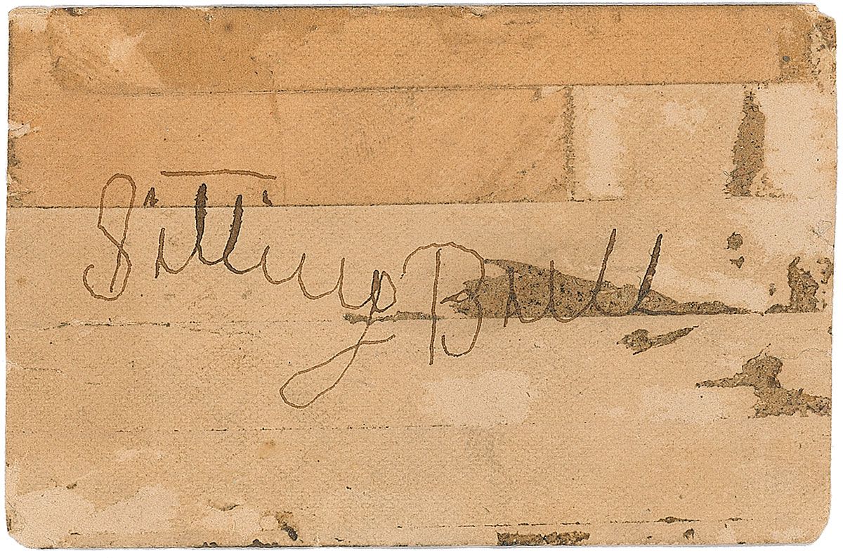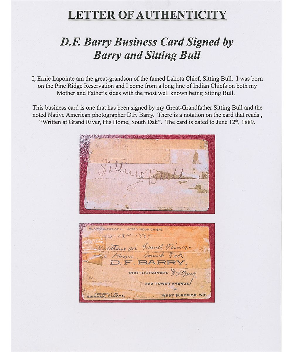 Extremely rare and highly-sought after ink signature, “Sitting Bull,” on the reverse of an off-white 3.5 x 2.25 business card of noted Native American photographer D. F. Barry. Front of the card bears a notation by Barry which reads, “June 12th 1889, Written at Grand River, his home, South Dak., D. F. Barry.” Also accompanied by a 2013 letter of authenticity from Sitting Bull’s great-grandson, Ernie Lapointe, with images of Lapointe and Sitting Bull which reads, in part: “I, Ernie Lapointe am the great-grandson of the famed Lakota Chief, Sitting Bull…This business card is one that has been signed by my Great-Grandfather Sitting Bull and the noted Native American photographer D. F. Barry.” Additionally, a color copy of a letter from Barry sending the signature to H. M. Brown, is included, which reads, in part: “Please find Sitting Bull autograph. This was written on 12th of June 1889…Sitting Bull was sick…when he wrote this.” In very good condition, with scattered toning from old tape to both sides, lightly affecting the tops of a few letters, soiling over portion of last name, not affecting legibility, and some other scattered mild toning and soiling, and slight surface loss at bottom.