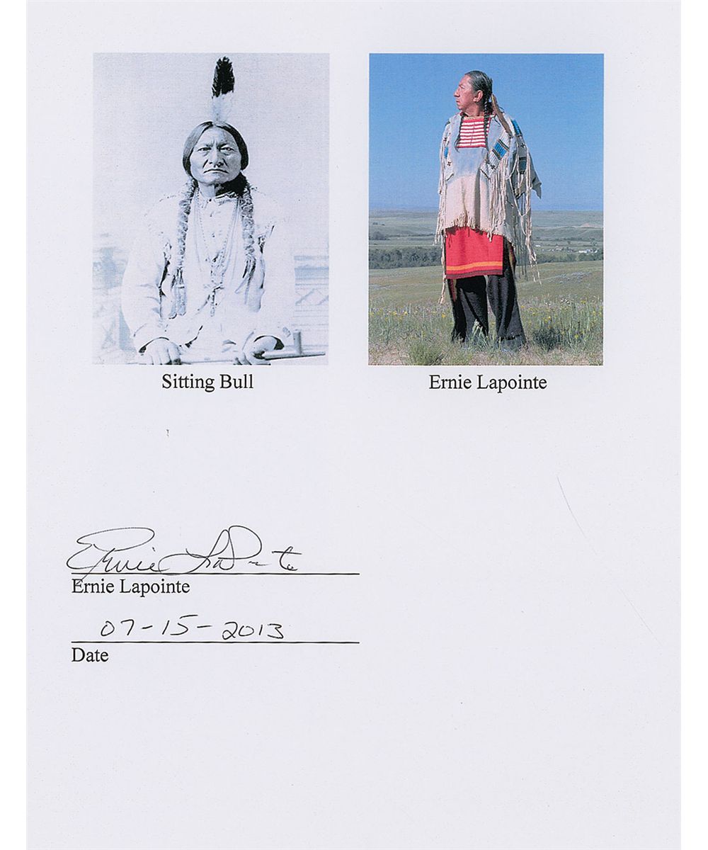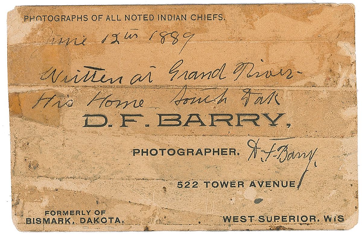 David Francis Barry was an accomplished photographer of Native American portraits, especially known for his iconic images of chiefs and other figures of the utmost historical importance. Despite the historically tenuous relationship between the Sioux and whites, Barry was able secure sittings with their warriors and leaders throughout the 1870s, even as they fought against General Custer on the battlefield. Whites called Barry the 'Sioux Charmer' because of his ability to ingratiate himself with their tribes, while the Native Americans knew him as 'Little Shadow Catcher,' because of his diminutive stature and ability to 'catch' images and commit them to paper. What is most remarkable about this piece, however, is the additional provenance provided by the chief’s great-grandson. Lapointe descends from a long line of chiefs—Sitting Bull on his mother's side—and has spoken on various television programs and published a biography of his great-grandfather. With this outstanding familial history and association with Barry, this is a fabulous example of arguably the most sought-after of all Western and Native American signatures.