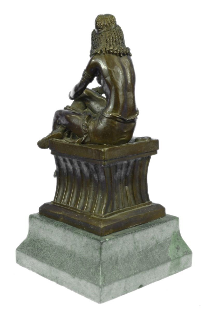 This Beautiful Sculpture Of A Woman Sitting On A High Gold Thick Pillar. She Poses While She Sits And Holds Her Right Knee That Is Place Under Her Left Leg. She Is Topless But Wears A Nice Long Skirt That Slits By Her Thigh Giving Her A Very Sexy Look. She Has The Most Amazing Necklace, Flower Head Piece, And Wristband To Match With Her Whole Outfit Including Her Gorgeous Gold Slippers. She Is Cast Using The Ancient "Lost Wax Method" And She Is Stained In Brown And Gold Patina While Mounted Atop A Green Marble Base. Bronze Dimensions With Marble Base: Height 15 X Width 8 inches. Weight: 25 Lbs.