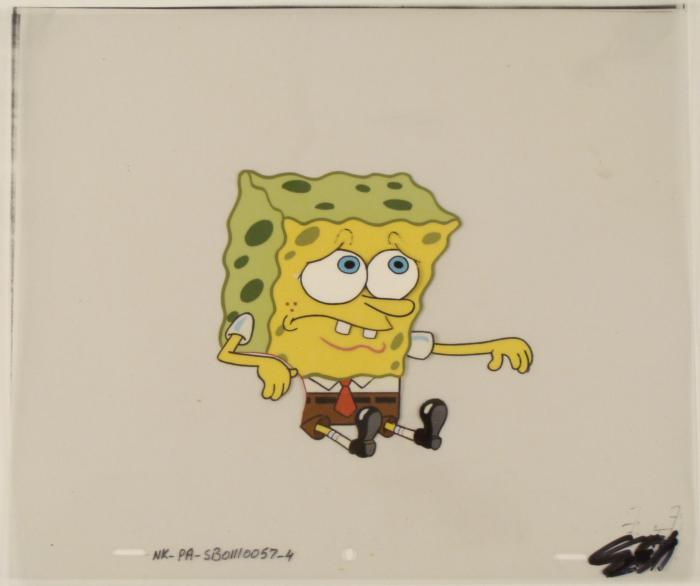 This original animation cel is from the Nickelodeon TV show SpongeBob Squarepants. The story takes place under the deep blue sea in Bikini Bottom, where SpongeBob resides. SpongeBob, who is a yellow, porous sponge, is your typical happy-go-lucky character, as he is always cheerful and enjoys making people laugh. Patrick Star, SpongeBob's neighbor who is a starfish, is your average children's show idiot, as he boasts knowing nothing and is often getting himself into ridiculous situations. Between the homes of these two lies the home of the miserable Squidward, a squid, who is known for being grouchy and playing tricks on SpongeBob and Patrick. Both SpongeBob and Squidward work at the Krusty Krab, a fast food business run by the greedy money-loving Mr. Krabs, a crab, the arch rival of the evil, possibly misunderstood, Plankton. Another neighbor, Sandy Cheeks, an athletic squirrel who normally wears an astronaut's space suit, was introduced in "Tea at the Treedome." She spends most of her time inventing and experimenting. SpongeBob appear to be sitting in a chairOriginal Production Animated Cel Overall Size of Cel: 10 1/2" x 12 1/2" Very Good ConditionThis is an original hand-painted cel set-up used in the production of an episode of "SpongeBob SquarePants." Each one-of-a-kind set-up represents a slight change in position of the characters. When individually photographed and projected in rapid succession, the images appear to move.