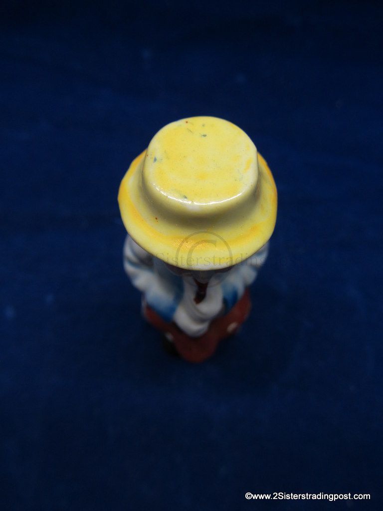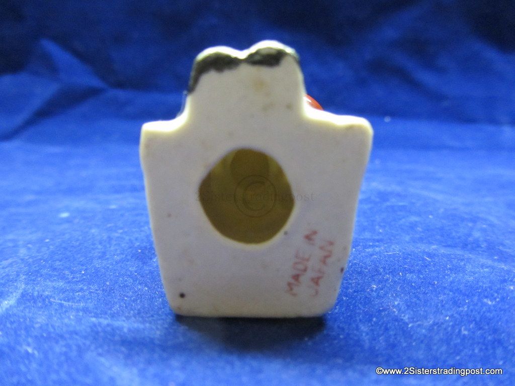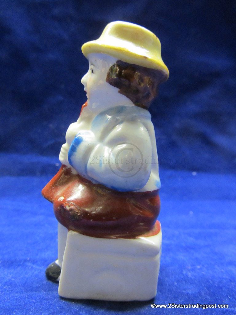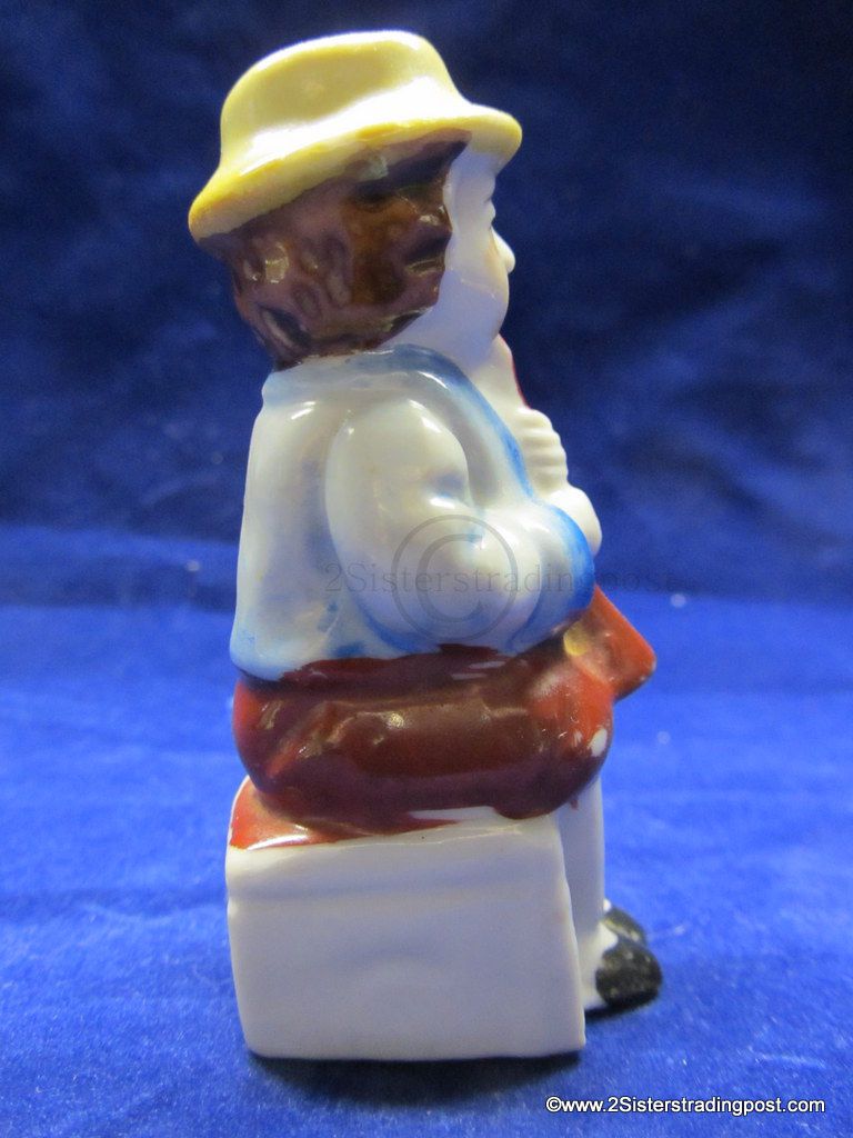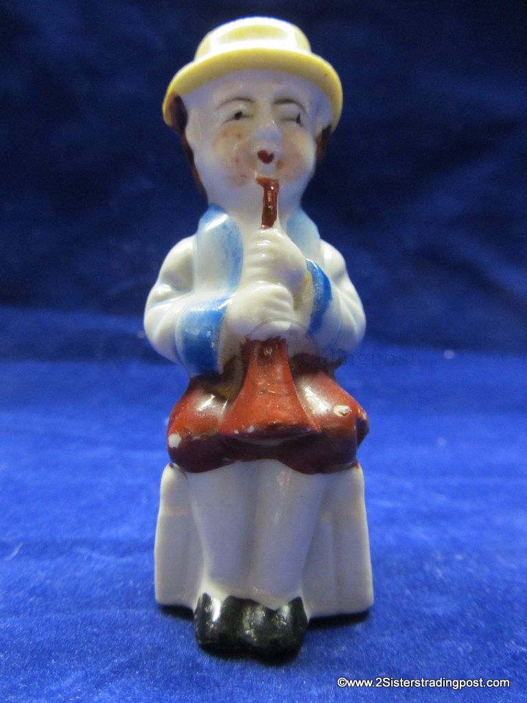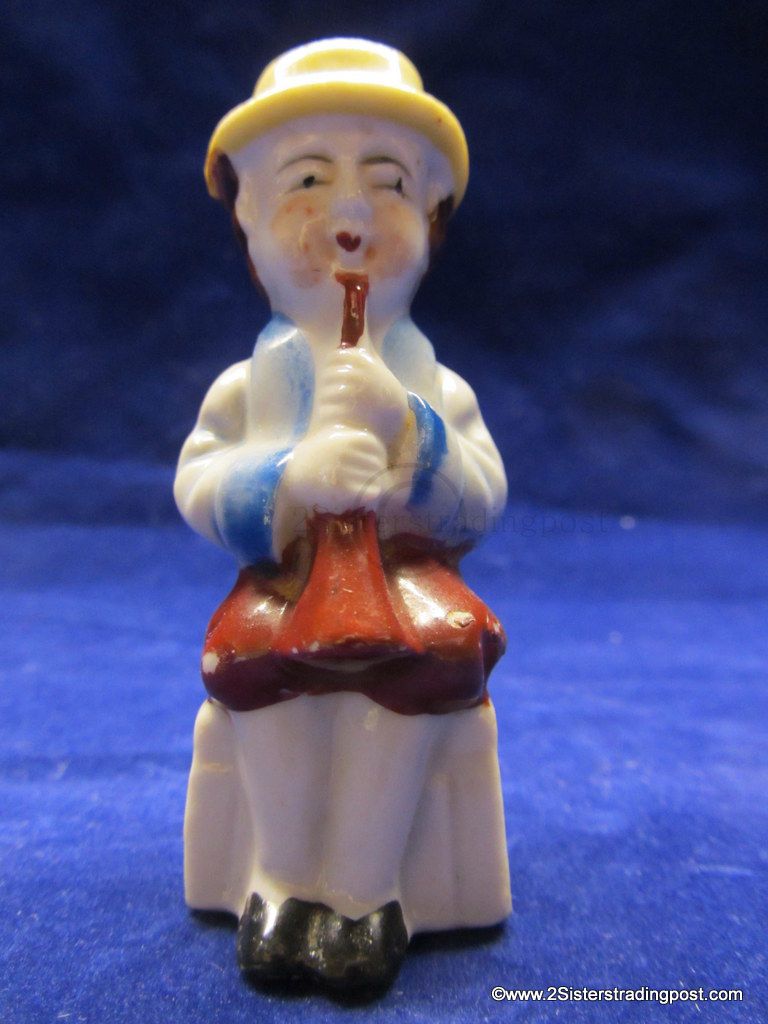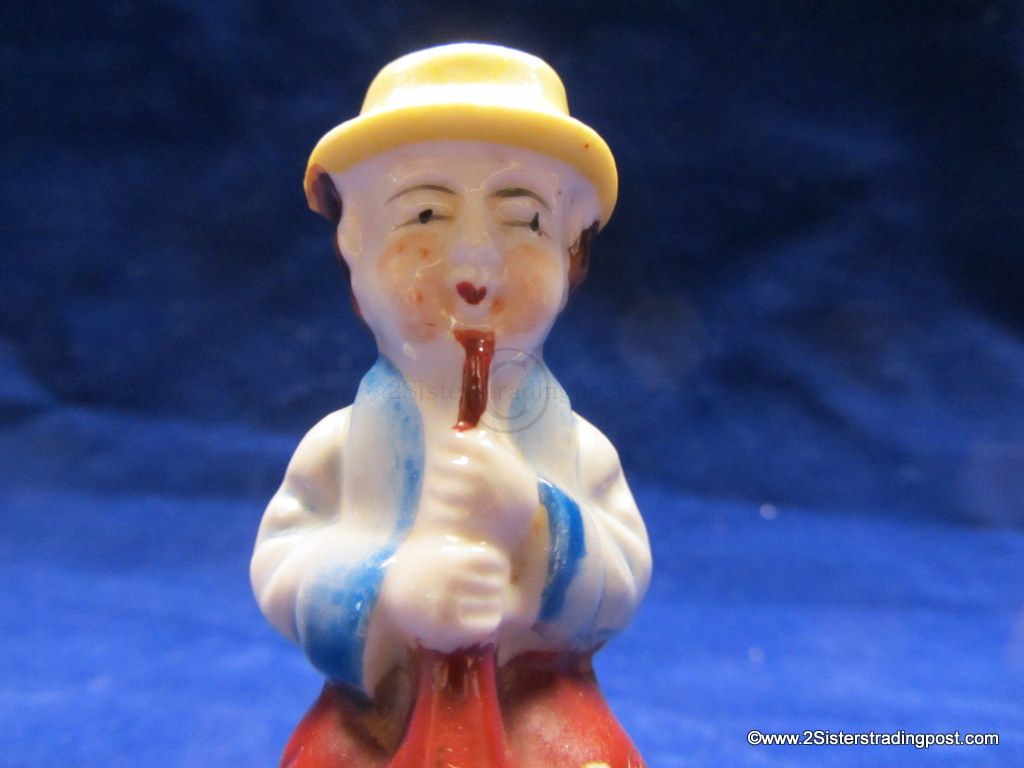 The little man sits straight and proper playing his tunes for all to hear. He measures approx. 2 5/8" tall, the base is 1.25" x 1". Great detail on mans face right down to his ruby checks. Nice figurine from the 40's Made in Japan