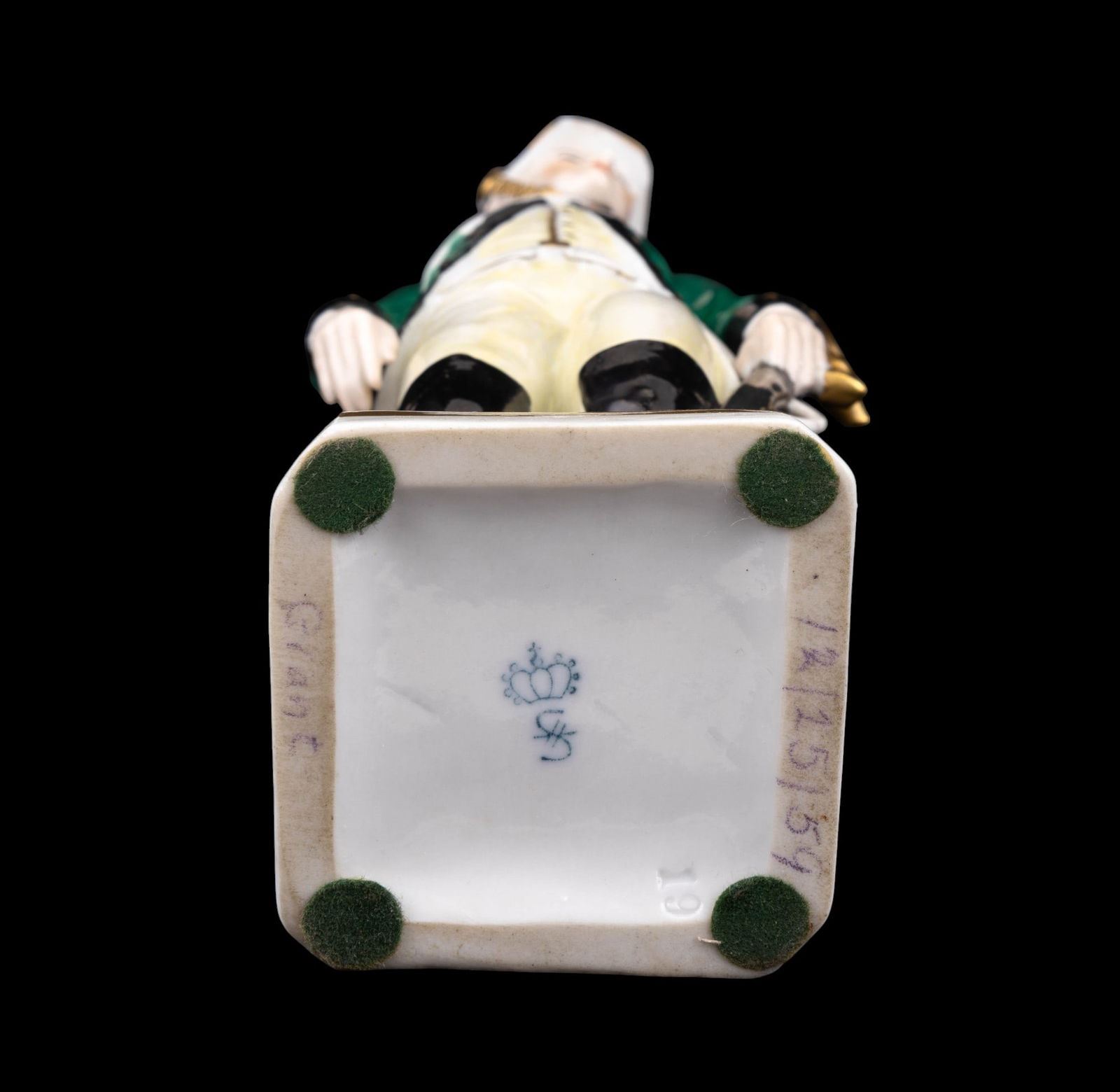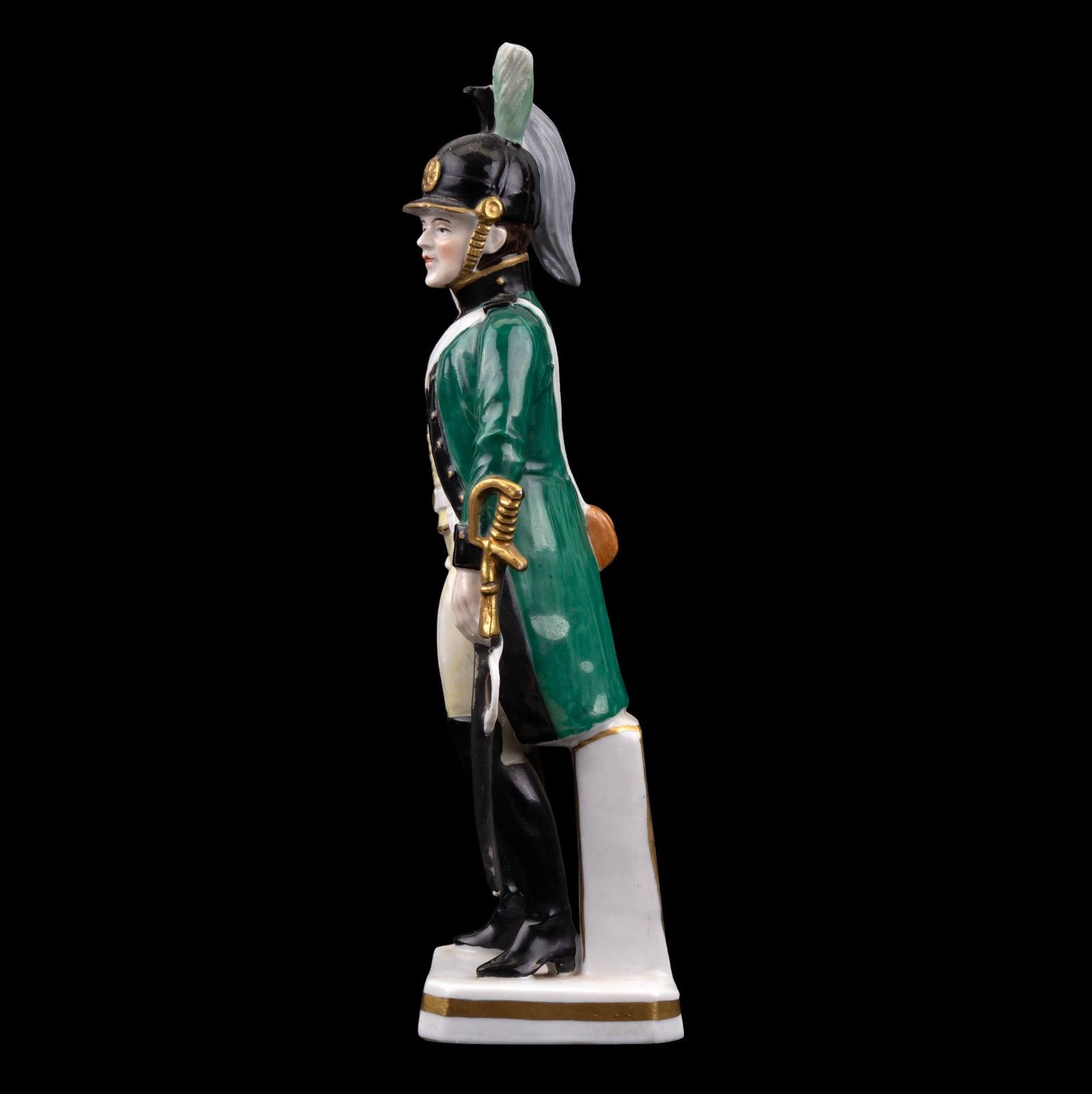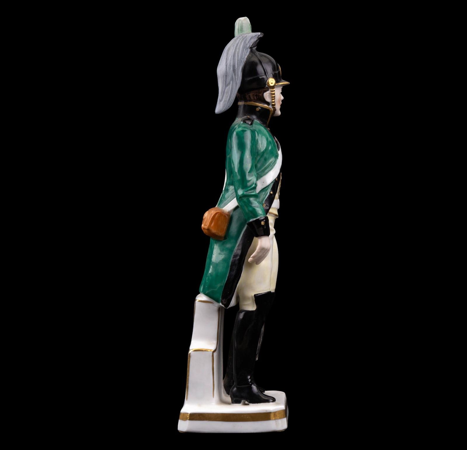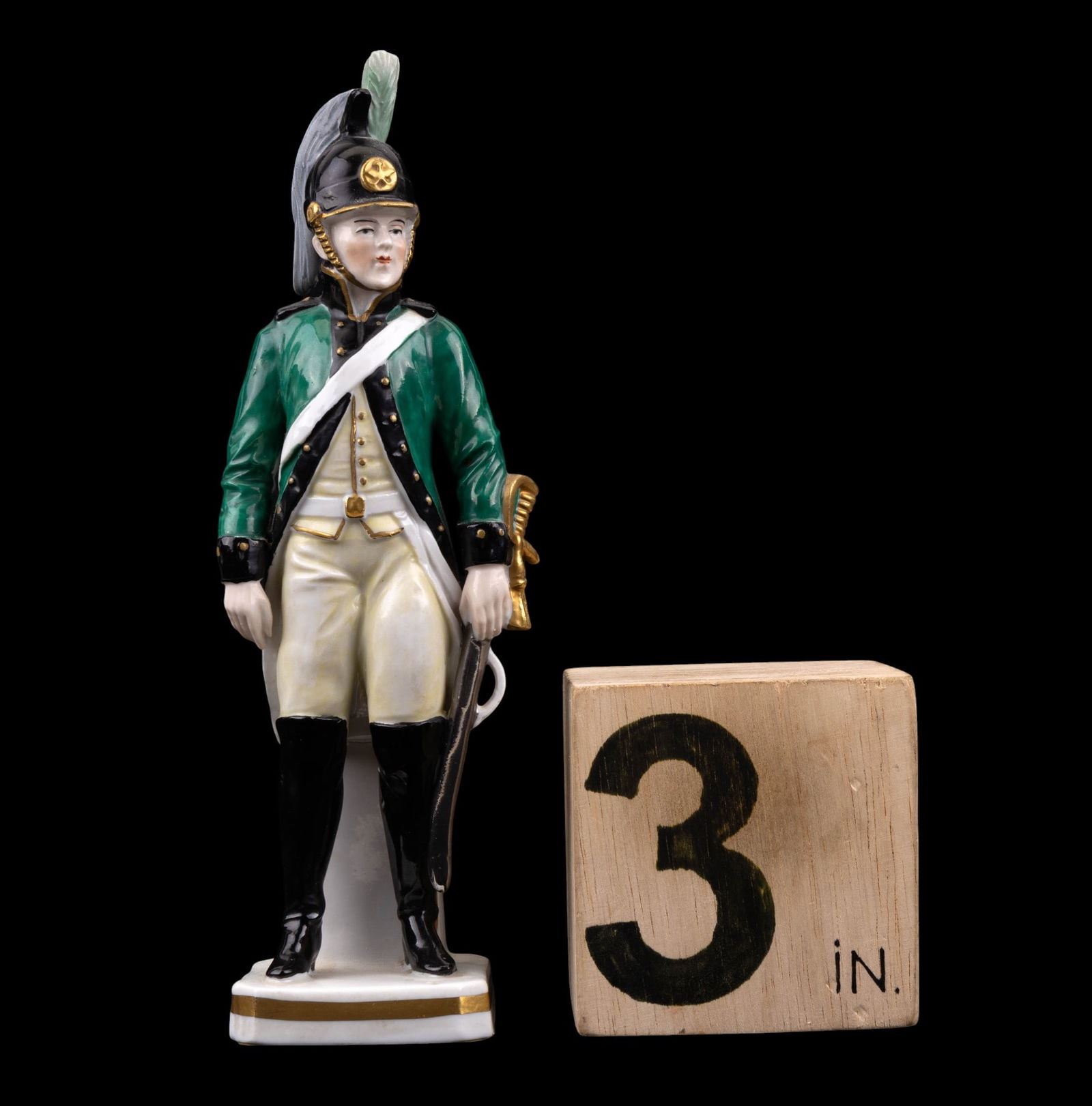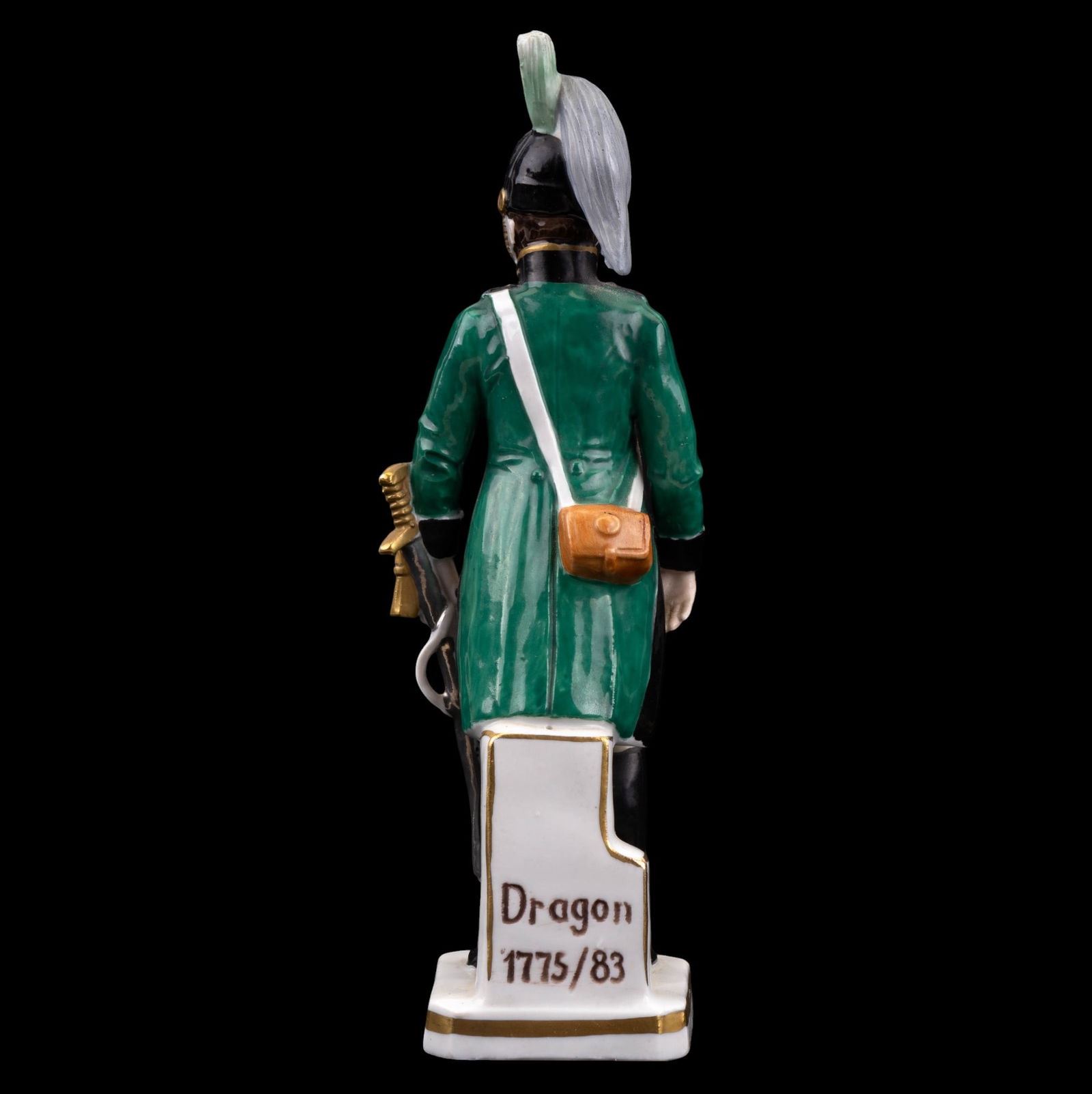 Sitzendorf military (similar to Revolutionary War PA Infantry soldier) porcelain figurine marked "Dragon 1775/83" on back and Sitzendorf logo on bottom and impressed 19. Figurine measures approx. 8.5" H. Handwritten on base 12/25/59.