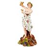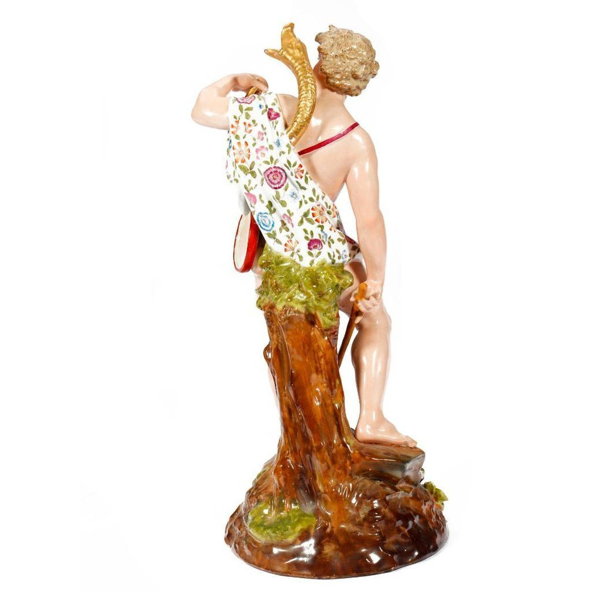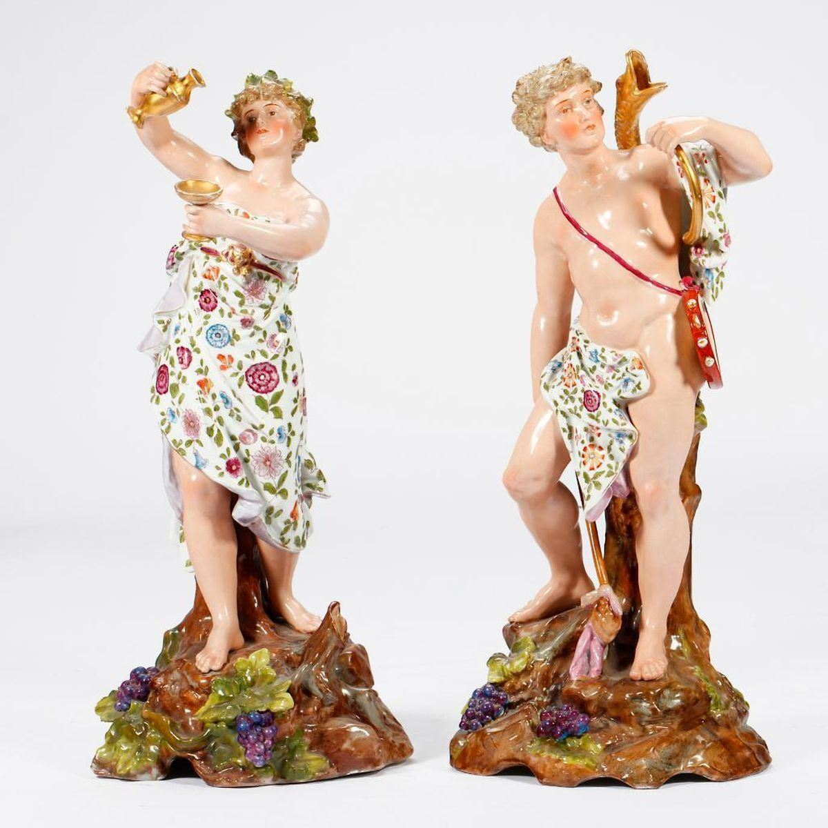 The pair of figures on grape-covered bases, the female with gilt decanter and chalice, the male figure with tambourine and gilt horn; with blue mark of parallel crossed lines on base. Each approx. 14 1/4in. high, approx. 6 1/4in. wide at the bases. Condition: Very good, only tiny chips on leaves of female.