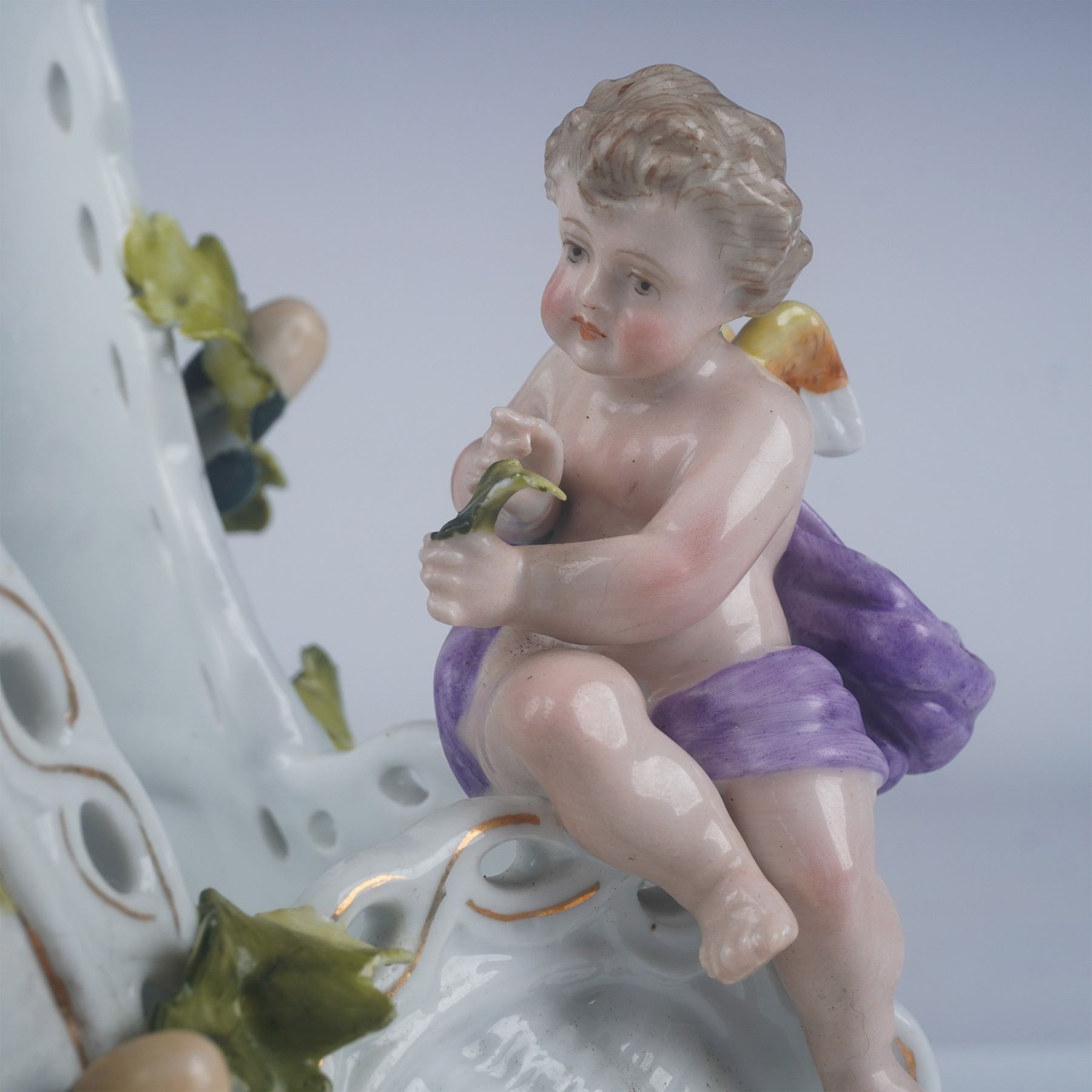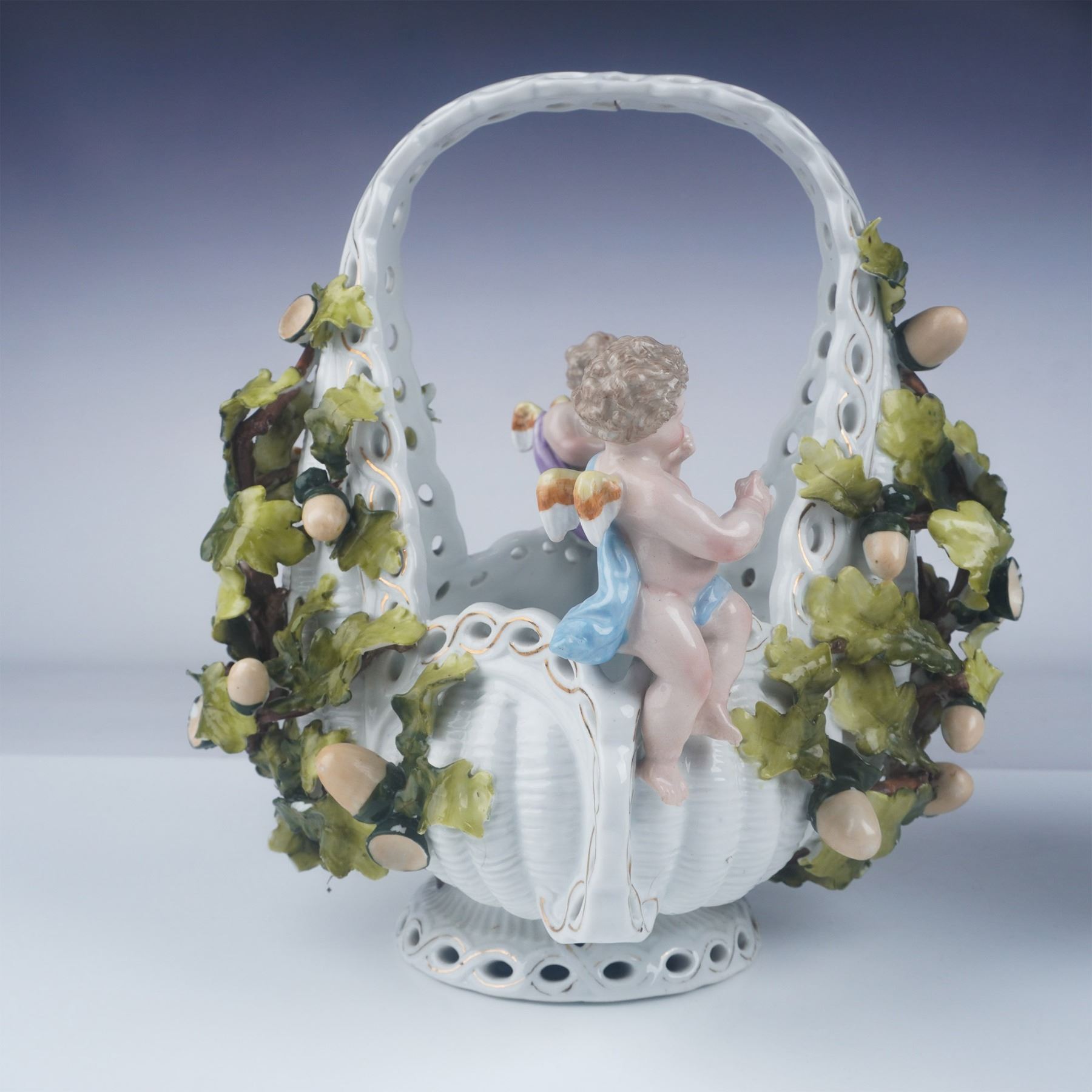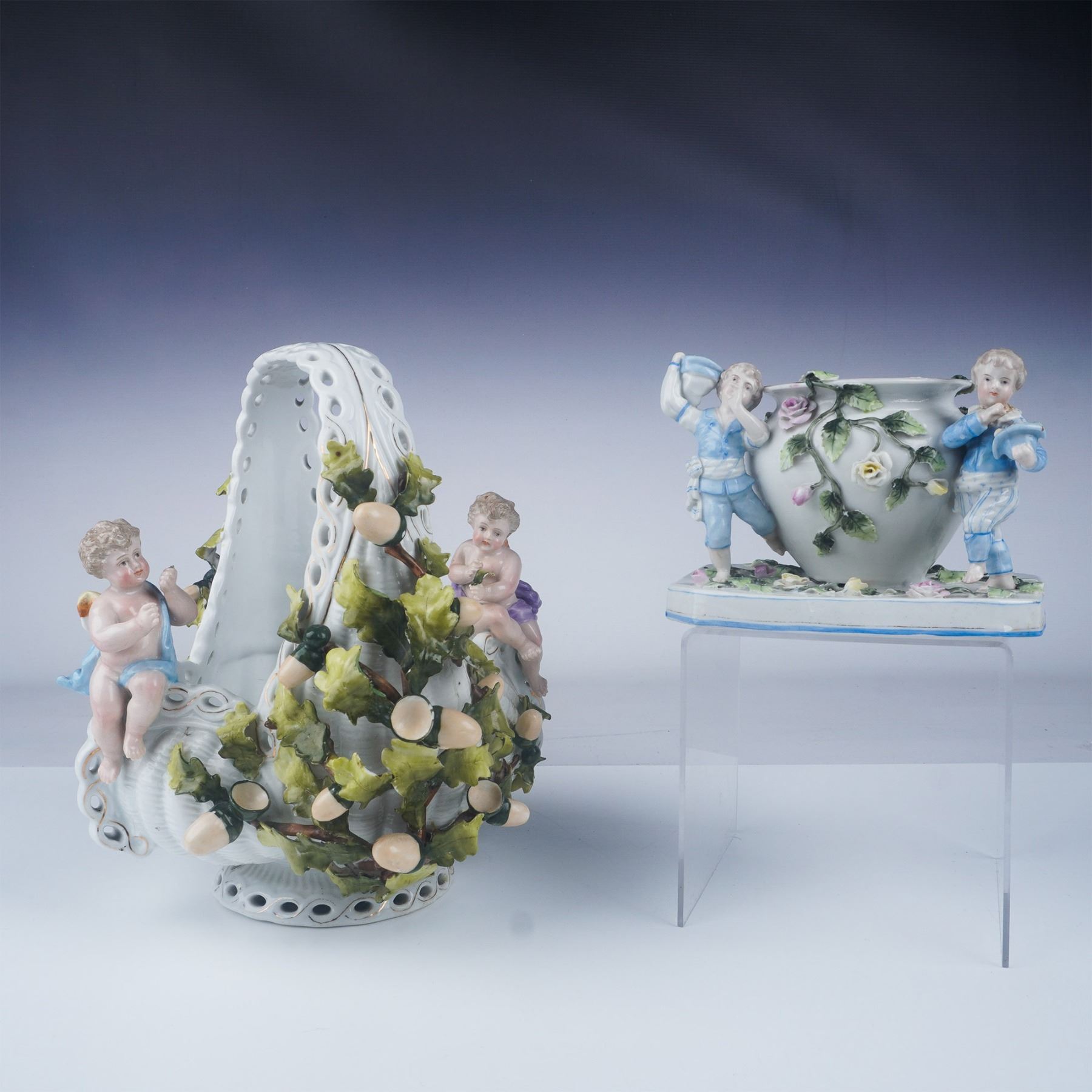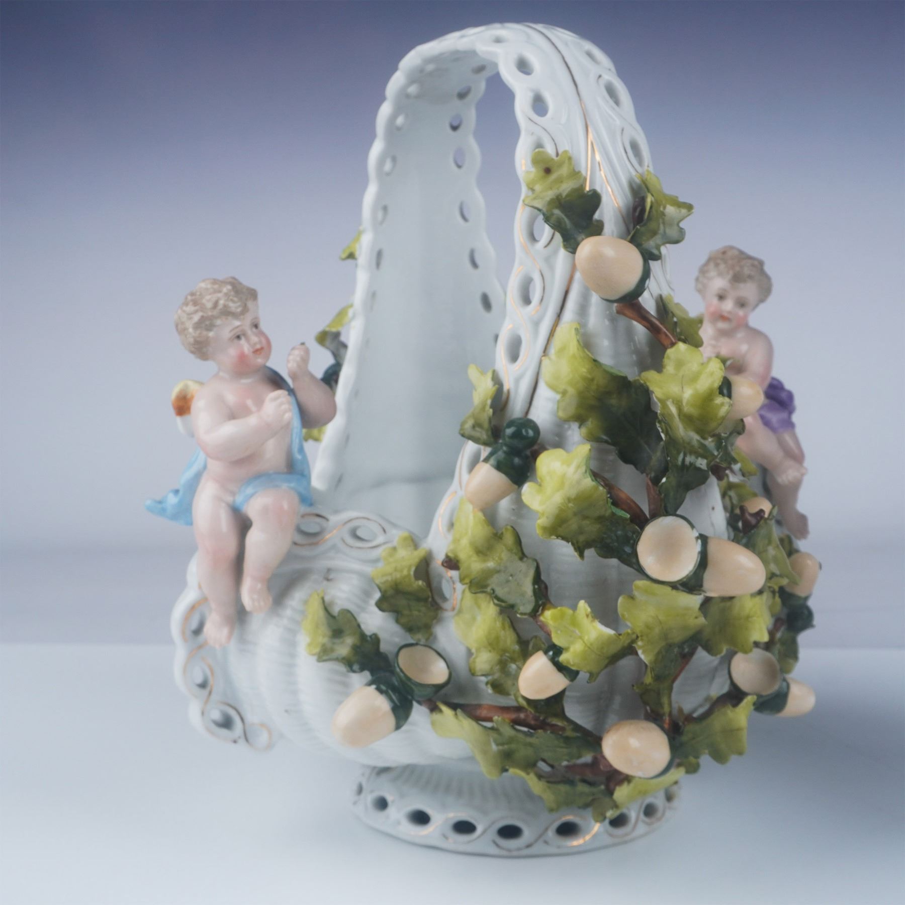 A pair of Sitzendorf porcelain pieces showcasing exquisite hand-painted details and intricate craftsmanship. The first item is a porcelain basket with an openwork design, adorned with cherubs and acorn-laden plants. The second piece is a porcelain vase depicting playful children and cherubs surrounding a rounded floral vase, embellished with climbing roses and greenery on a rectangular base. Both items bear the Sitzendorf backstamp, confirming their authenticity. Largest item measures 9.75"H.
