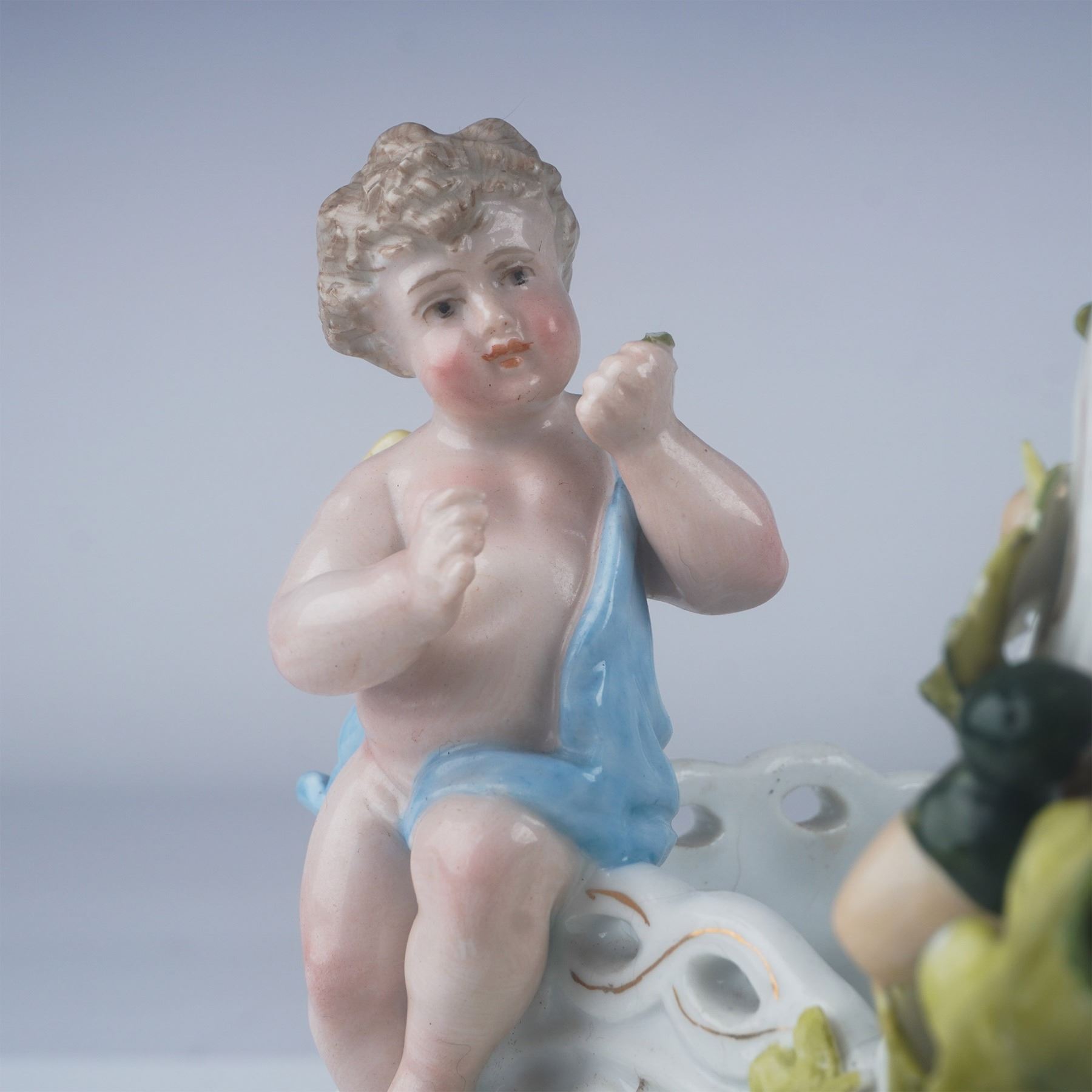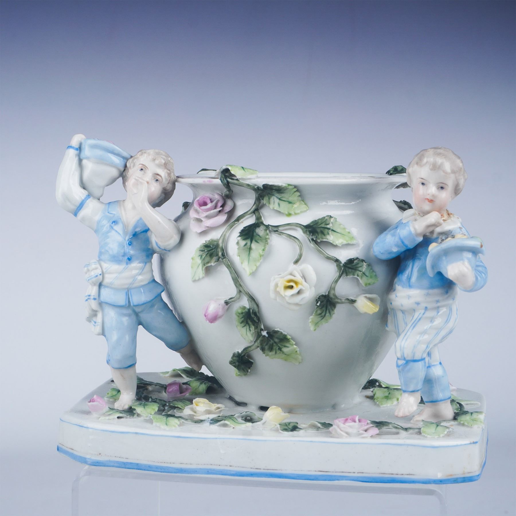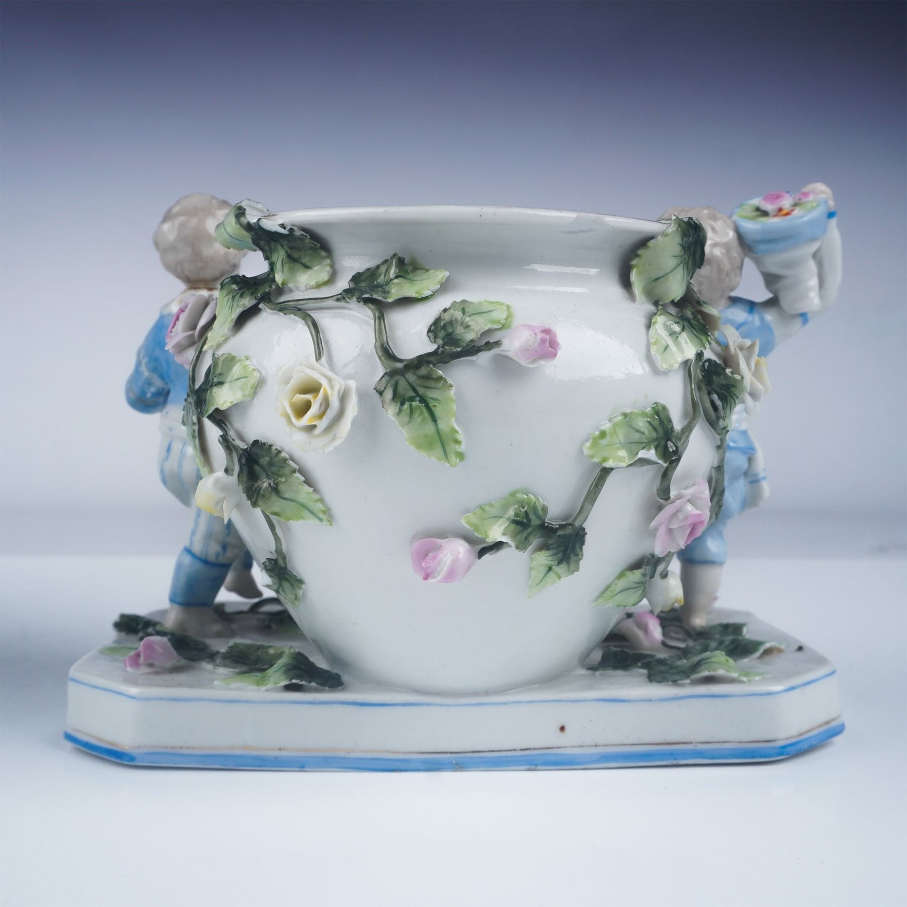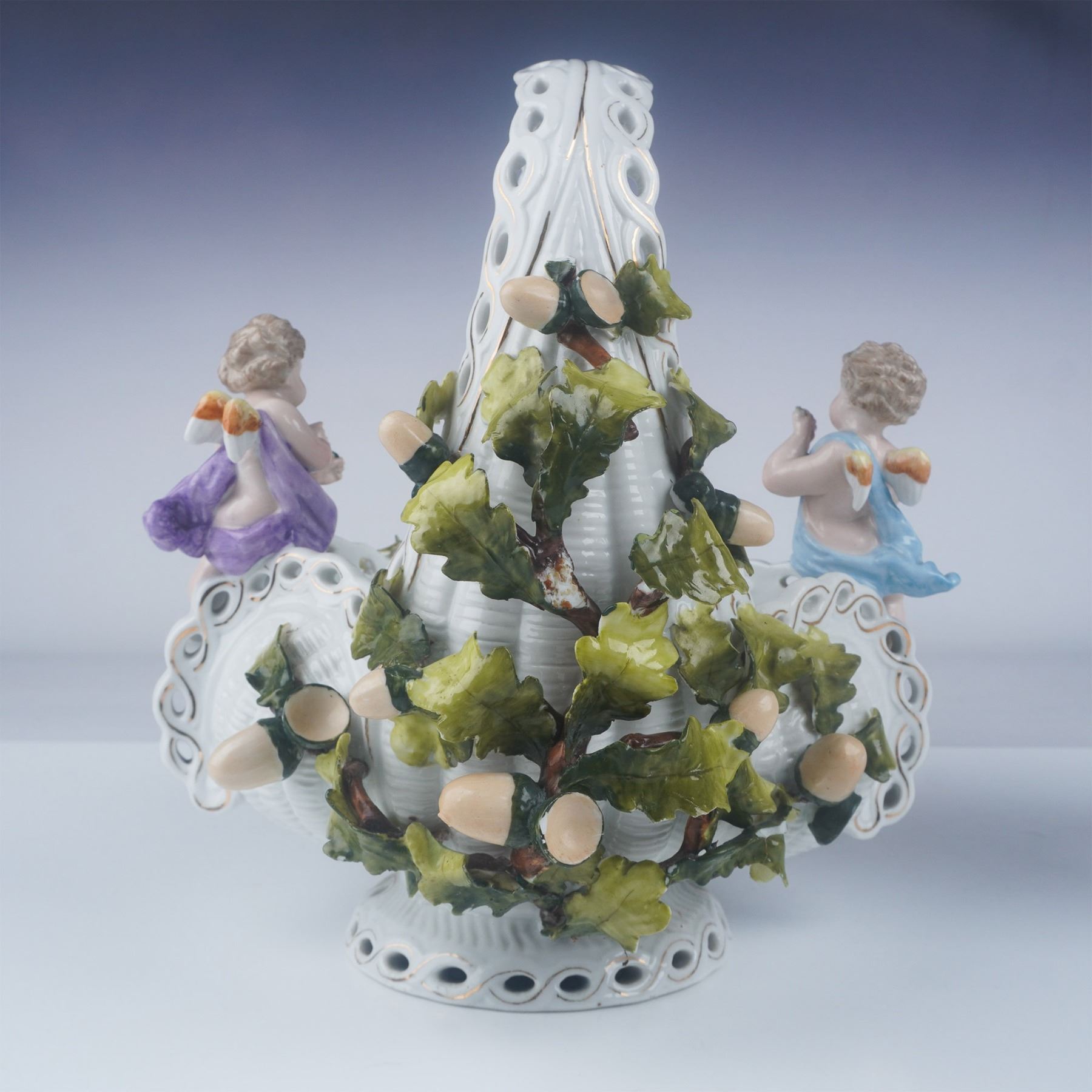 A pair of Sitzendorf porcelain pieces showcasing exquisite hand-painted details and intricate craftsmanship. The first item is a porcelain basket with an openwork design, adorned with cherubs and acorn-laden plants. The second piece is a porcelain vase depicting playful children and cherubs surrounding a rounded floral vase, embellished with climbing roses and greenery on a rectangular base. Both items bear the Sitzendorf backstamp, confirming their authenticity. Largest item measures 9.75"H.
