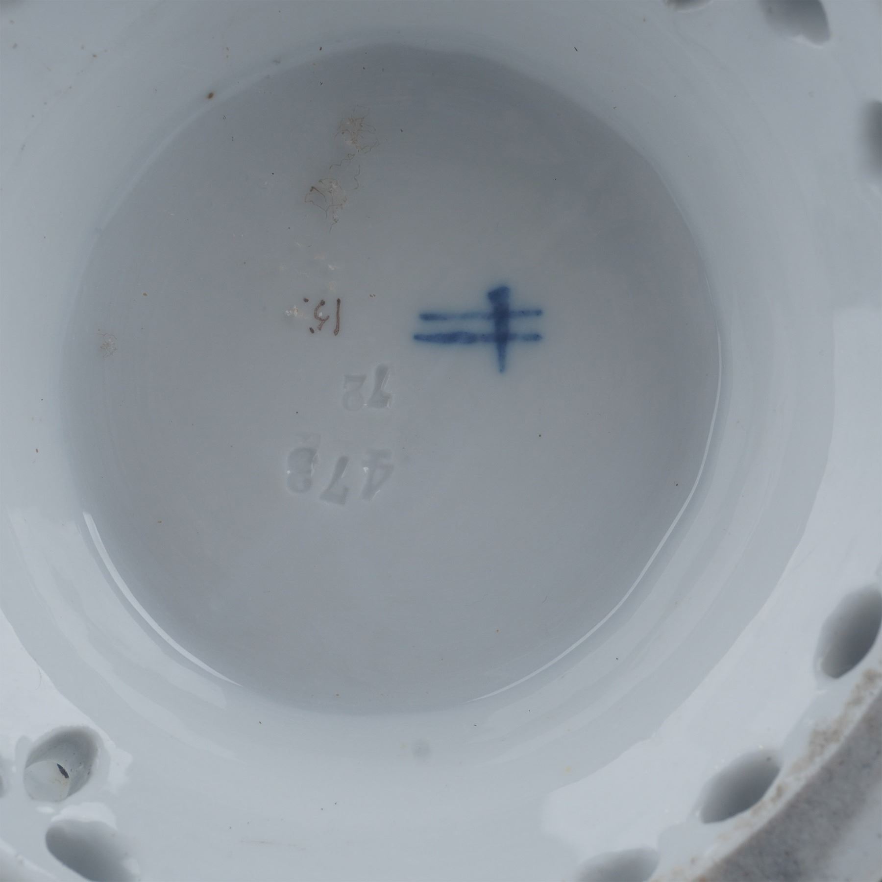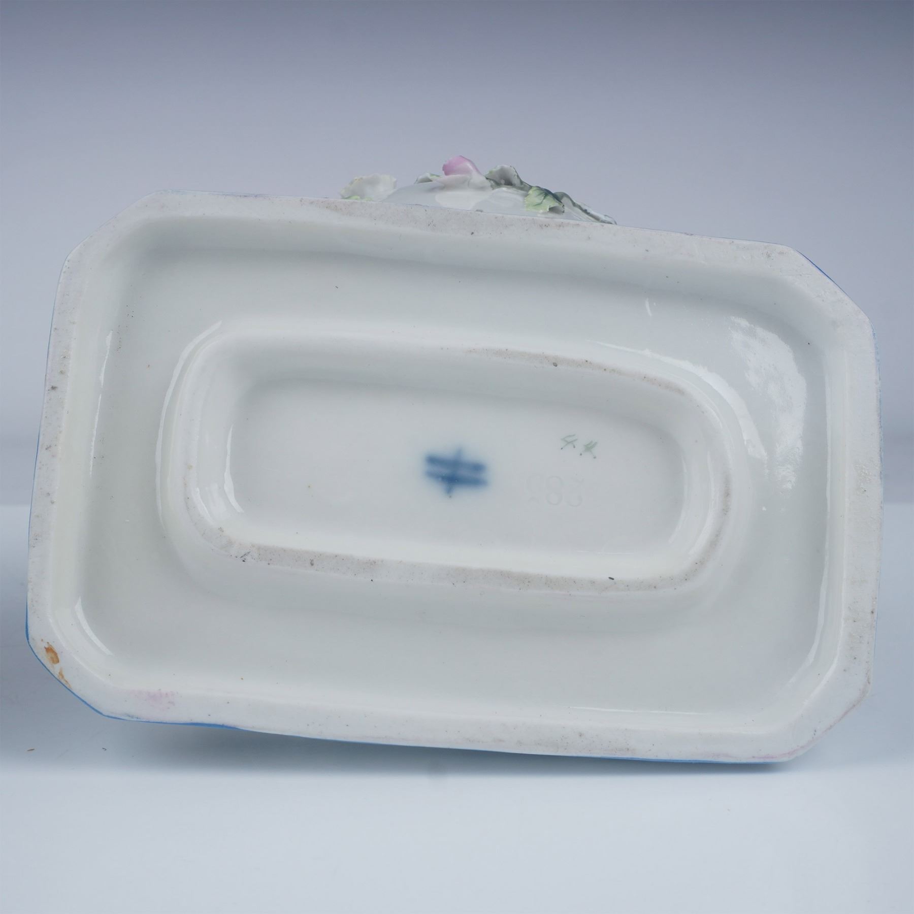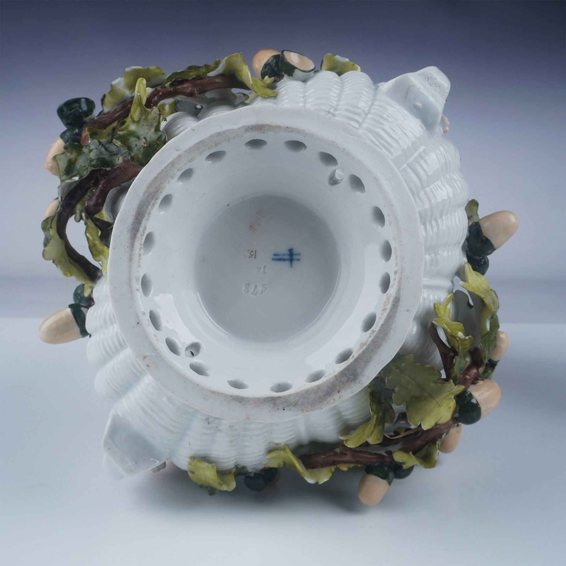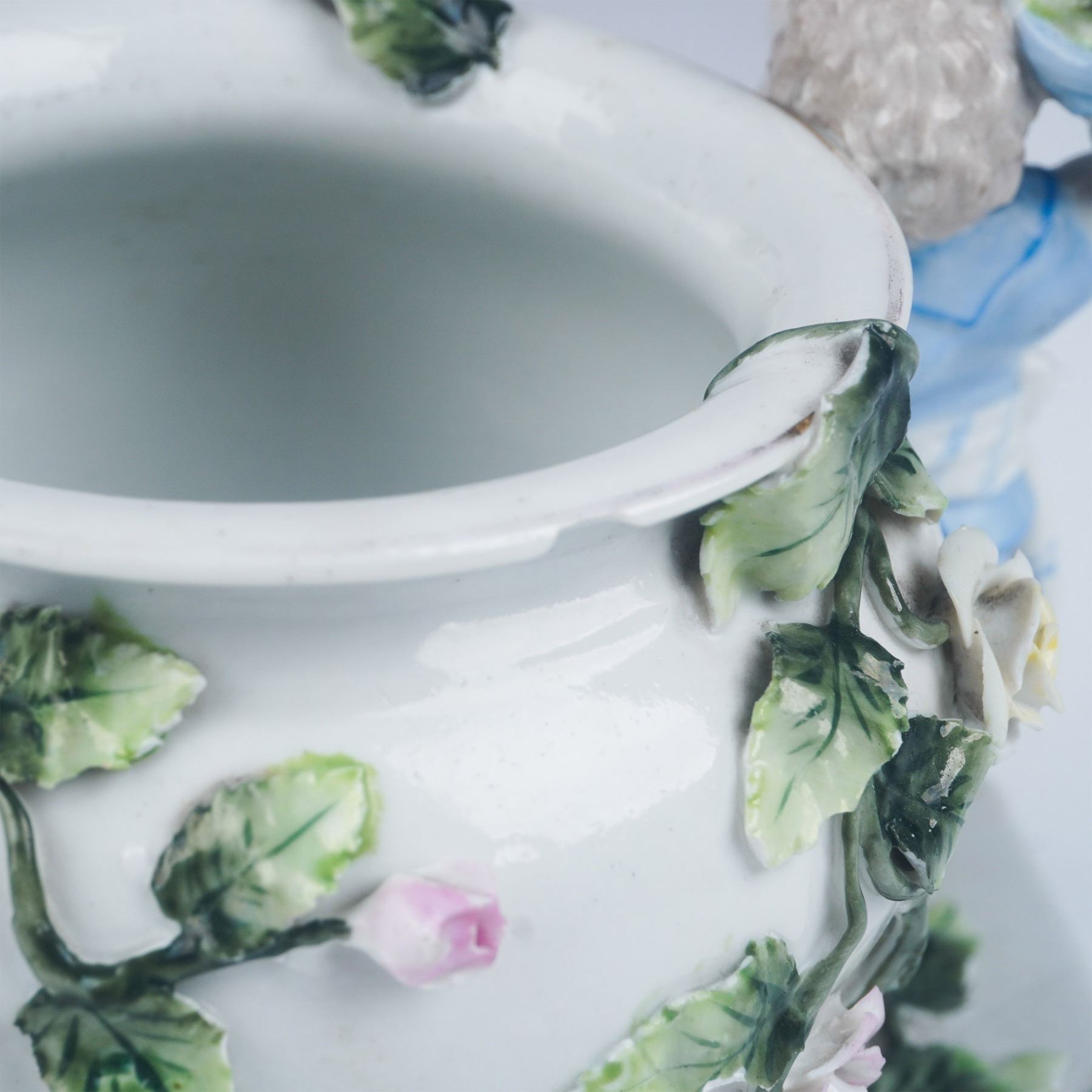 A pair of Sitzendorf porcelain pieces showcasing exquisite hand-painted details and intricate craftsmanship. The first item is a porcelain basket with an openwork design, adorned with cherubs and acorn-laden plants. The second piece is a porcelain vase depicting playful children and cherubs surrounding a rounded floral vase, embellished with climbing roses and greenery on a rectangular base. Both items bear the Sitzendorf backstamp, confirming their authenticity. Largest item measures 9.75"H.