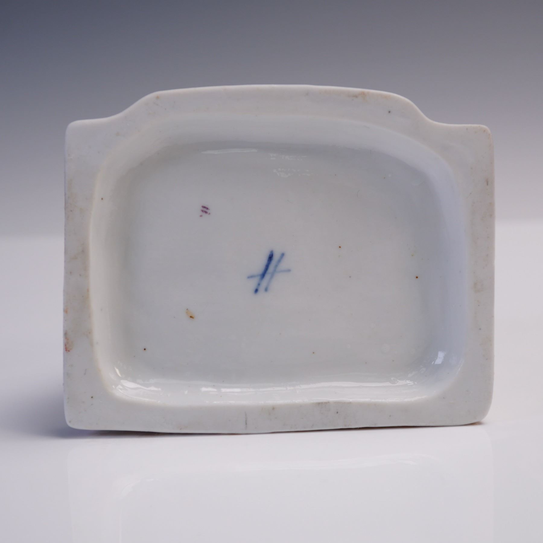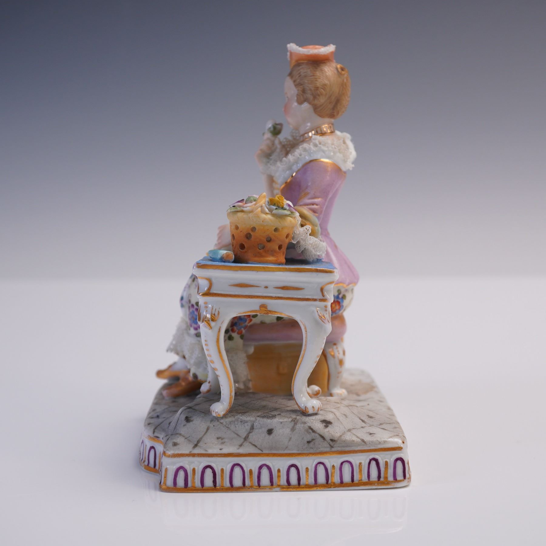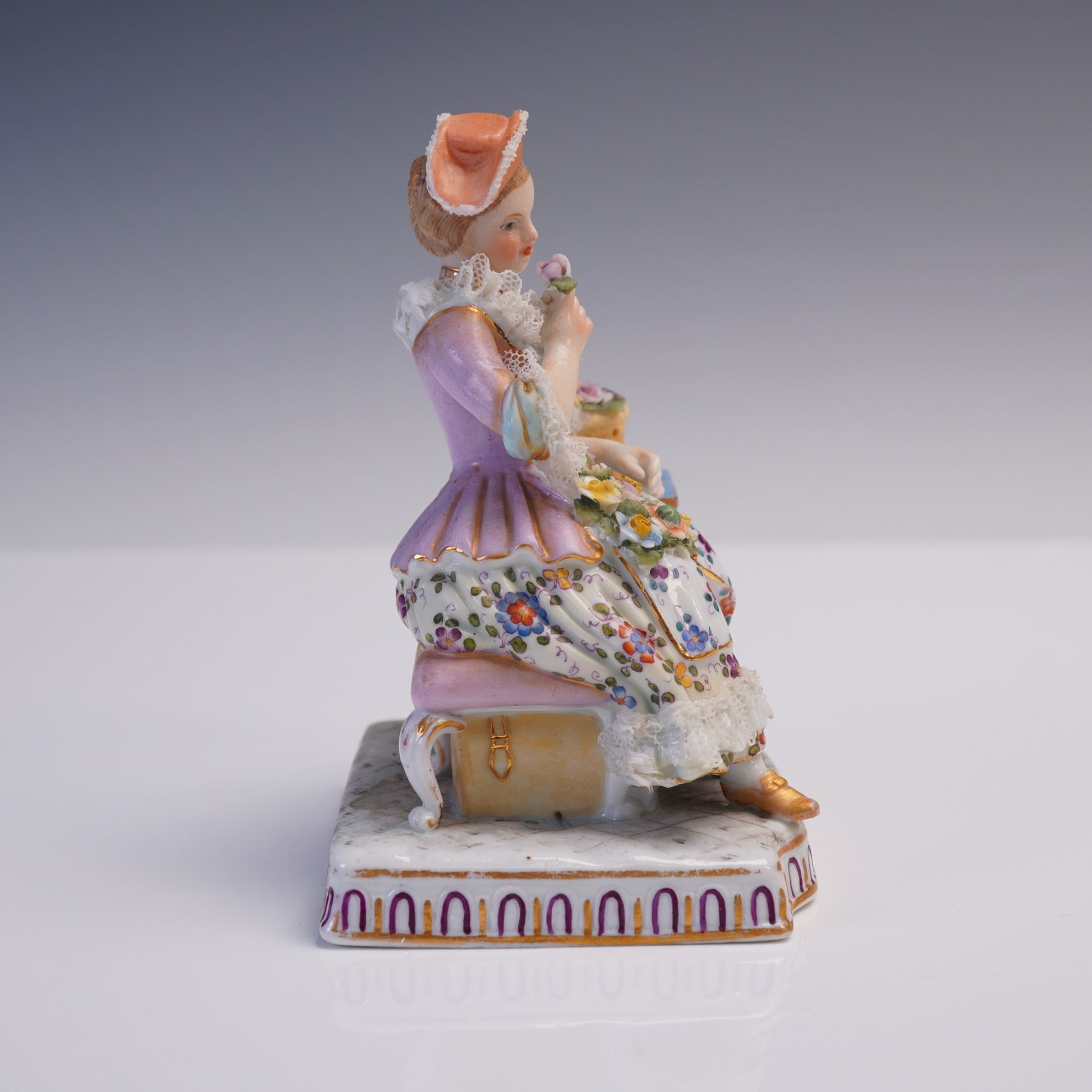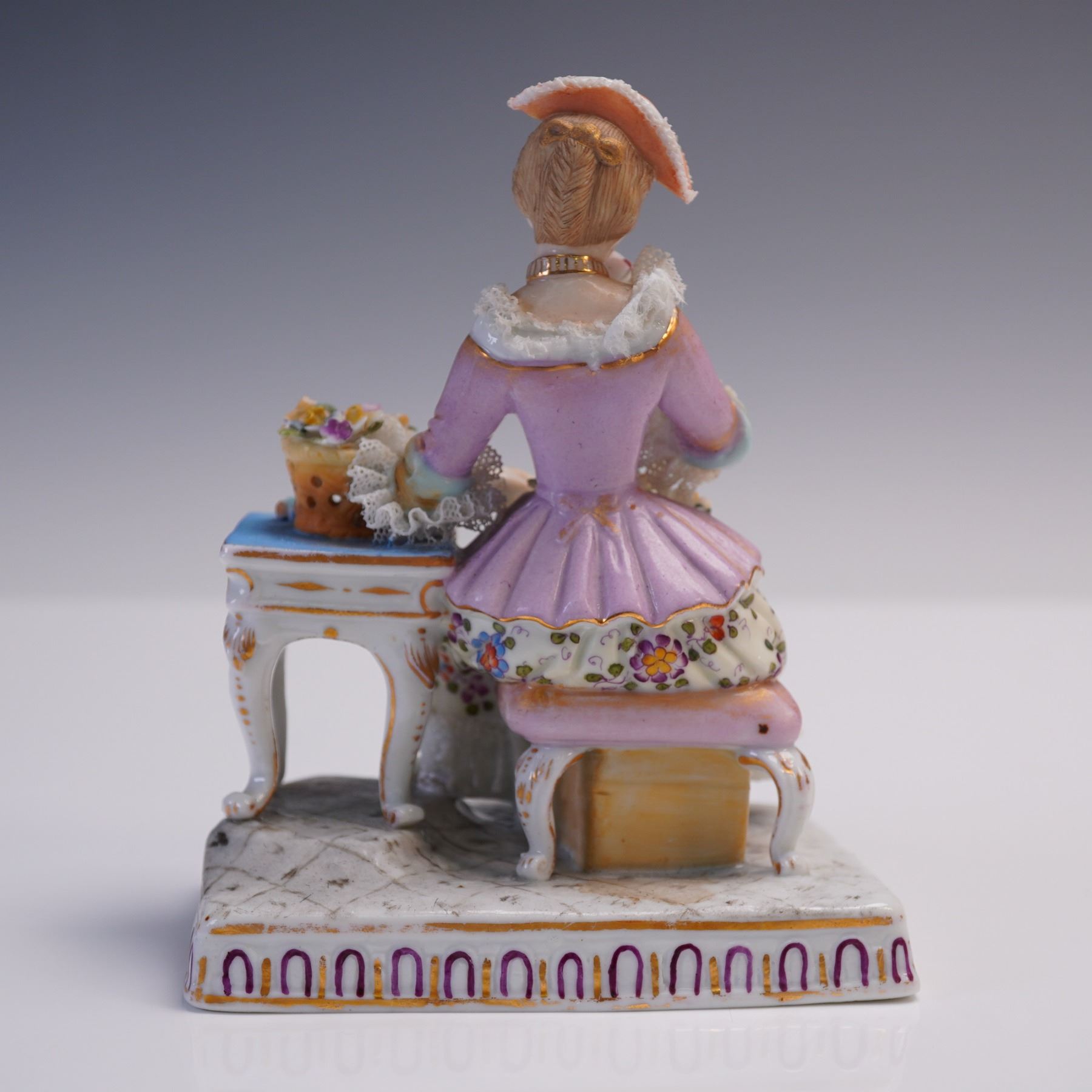 A charming late 19th to early 20th century Sitzendorf porcelain figural group, depicting a seated lady arranging flowers. Elegantly modeled and finely hand-painted in vivid polychrome enamels, the figure is adorned in a floral-decorated skirt with lace-applied trim, striped bodice, and peach bonnet. She sits beside a white rococo-style table with gilt highlights, supporting a wicker-style basket of colorful blossoms. The porcelain is mounted on a rectangular base with molded tile pattern and a gilt-and-lavender loop border. The composition captures a moment of serene domestic leisure with notable attention to period attire and naturalistic floral details. Marked underside with Sitzendorf's underglaze blue slash mark.