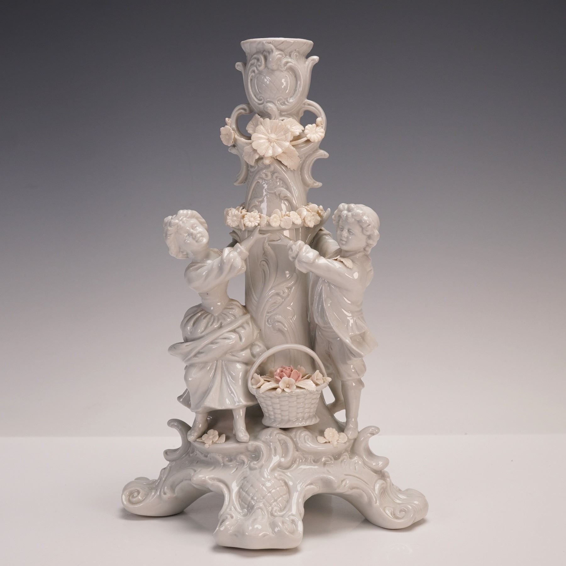 A finely modeled Sitzendorf porcelain candlestick featuring a boy and girl in period dress standing at an ornate rococo style column. The figures support a floral garland around the stem, while a basket of flowers rests at their feet. The candlestick is richly decorated with raised scrollwork and applied blossoms, rising to a single candle holder at the top. Marked with the blue crossed branches Sitzendorf backstamp on the underside, this piece dates to the early to mid 20th century and highlights the detailed craftsmanship of the German manufactory.