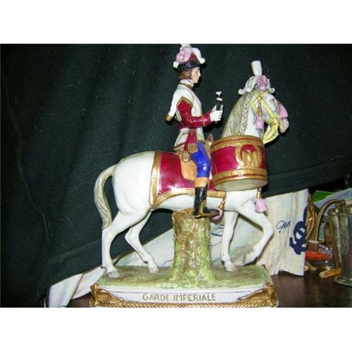 This particular figurine is 11 inches high. He sits astride a beautiffully decorated horse and mounted just ahead of the saddle are drums on either side, decorated in gold and red with Imperial Eagles.
