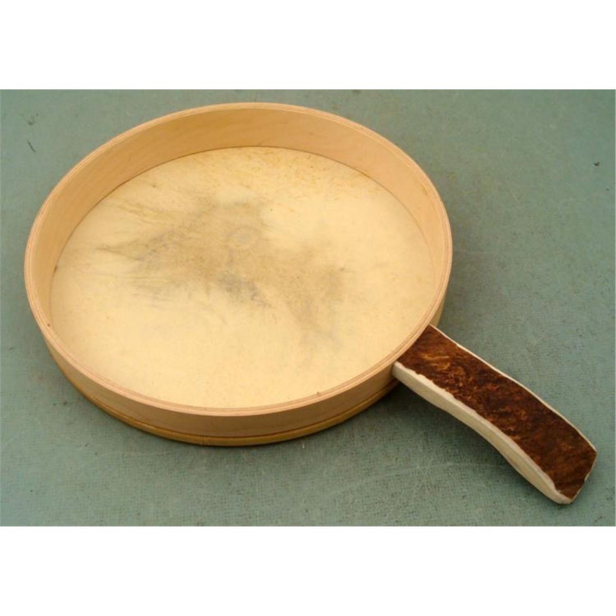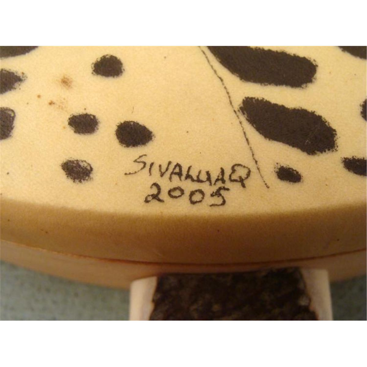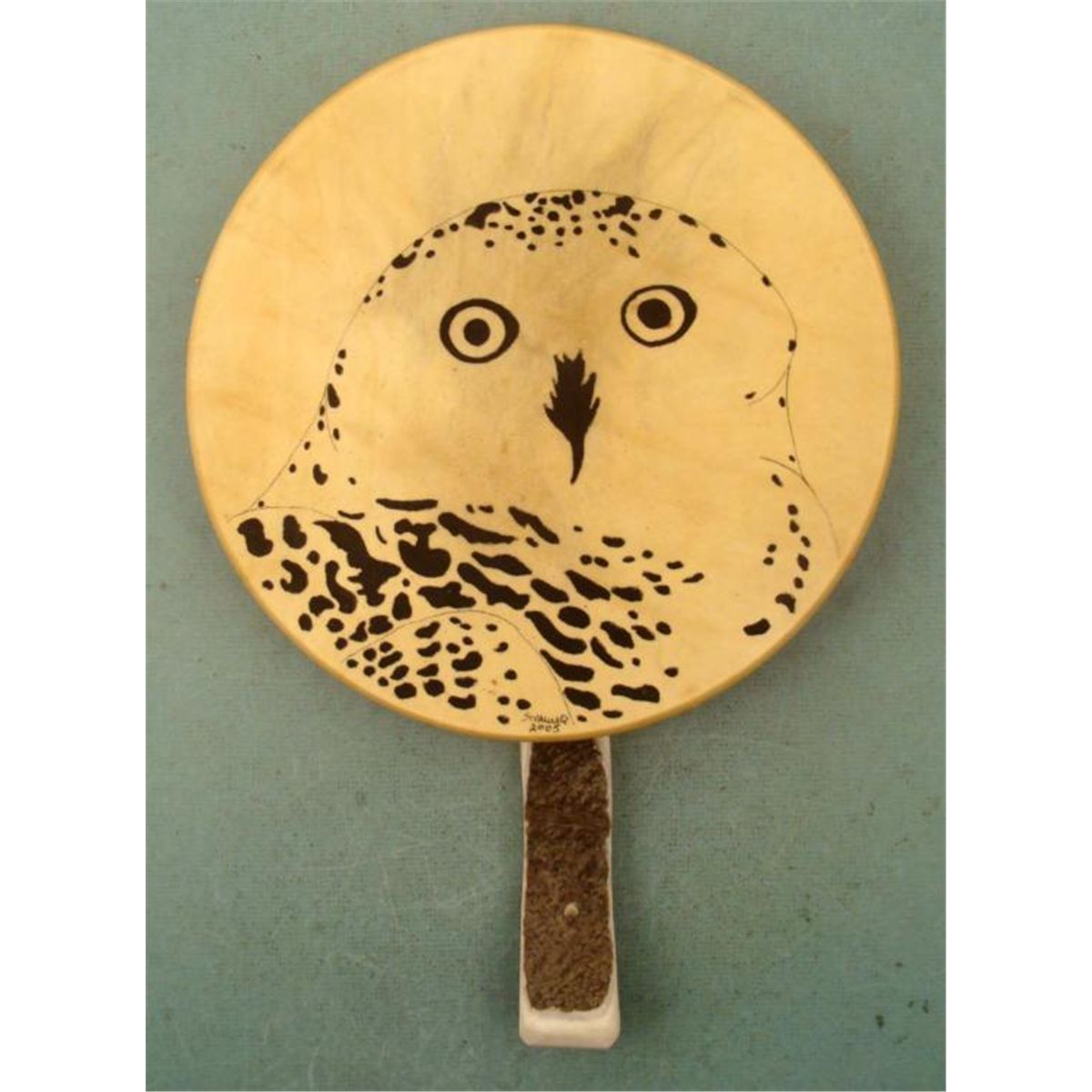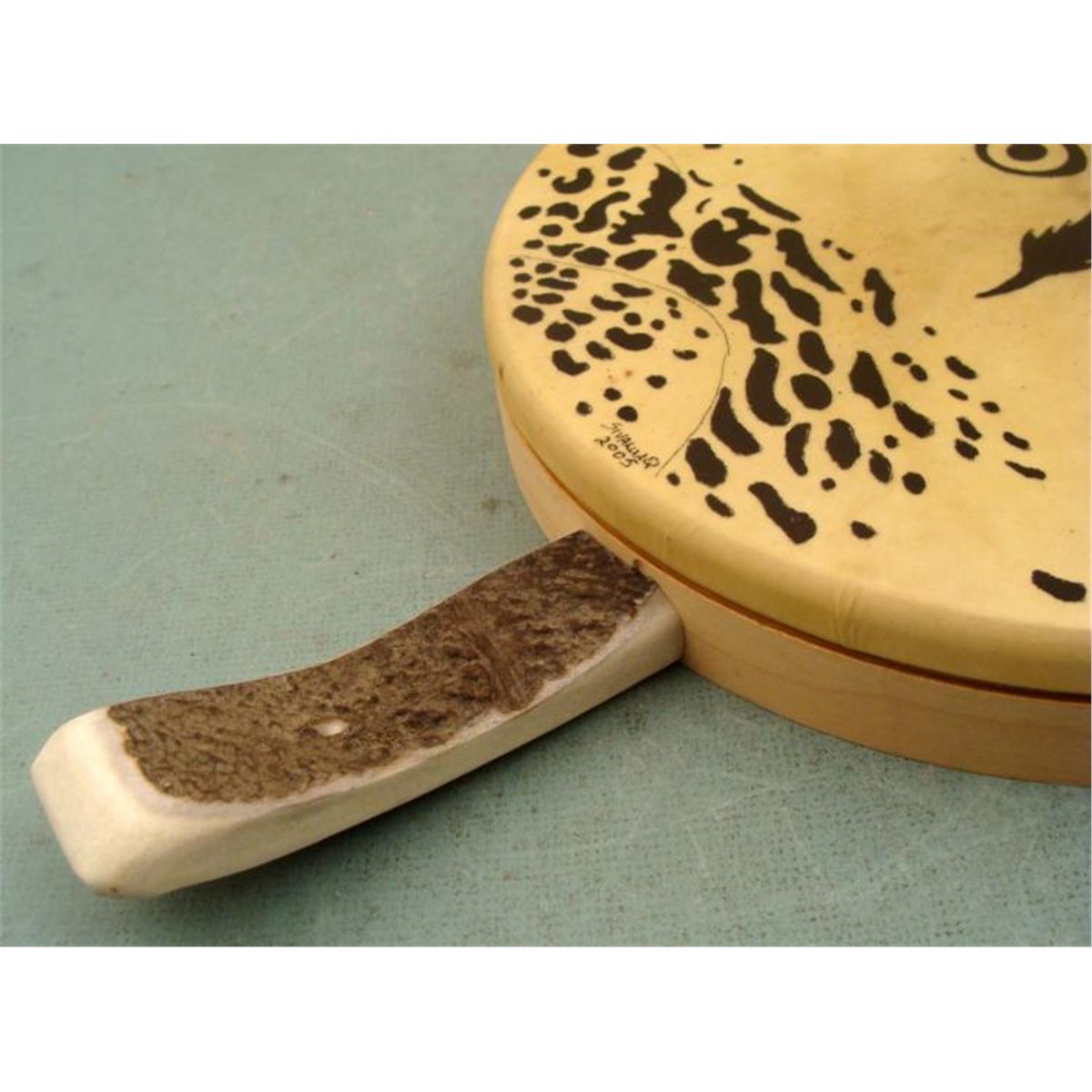 This is an Alaskan Native tribal drum created by artist Jerry Lieb, who is known as "Sivaluaq." His signature appears on the lower edge of the top, along with the date 2005. The drum skin is painted with an image of a northern spotted owl. The handle is made of caribou horn. The drum is in excellent condition and has a nice sound. The diameter is 9 3/4". * This is a terrific drum for anyone who loves Native and tribal art and instruments.