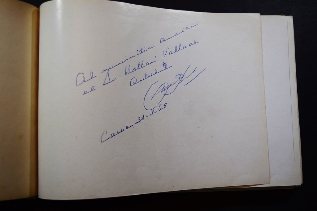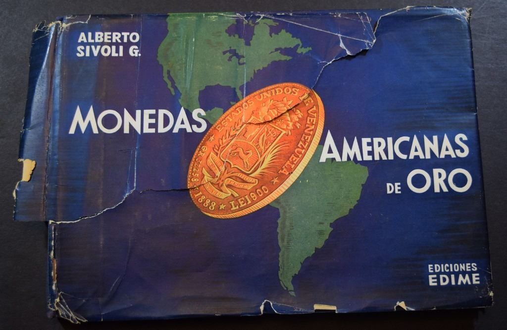 Sivoli G., Alberto. MONEDAS AMERICANAS DE ORO. EPOCA REPUBLICANA. EDIME. 1955. 12mo. 217 pages. Original pictorial boards, some bumping along the edges. Dust jacket torn and chipped but mostly complete. Very good. b&w plated throughout. Inscribed to Wallace by the author. This book is a guide to the large denomination gold types of North, Central, and South America and include all aspects of the coin from denomination, fineness, mintage, mint, and notes about the type. Lot weight: 1 lbs 5oz. Subject(s): Coinage - Latin American.