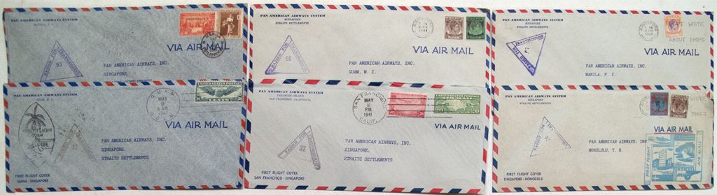 1) Pan American Airways, Inc. cover of first flight from Guam to Singapore 15105 2) Pan American Airways, Inc. cover of first flight from Singapore to Guam 15106. 3) Pan American Airways, Inc. cover of first flight from Manila to Singapore 15105 4) Pan American Airways, Inc. cover of first flight from Singapore to Manila 15106. 5) Pan American Airways, Inc. cover of first flight from San Francisco to Singapore 15098. 6) Pan American Airways, Inc. cover of first flight from Singapore to Honolulu 15106.