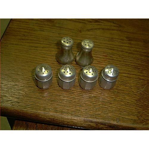 Six (6) assorted salt and pepper shakers. The largest ones say E & J B Nickle Silver Sheffield Made in USA 6900. They are 1 1/4" H X 1" W and show use of age. The bottom is marked on them. The other 4 are very light metal, possible Nickle silver, or Aluminum and are in very good condition. A couple have some very small dings right on the tops, and are not bad at all, just want you to know. They are very cute and very unique looking and a nice add to anyone who collects old ones like this. They are not bad looking at all, just showing use and age, and that is what you like in old pieces. Hope you like them.