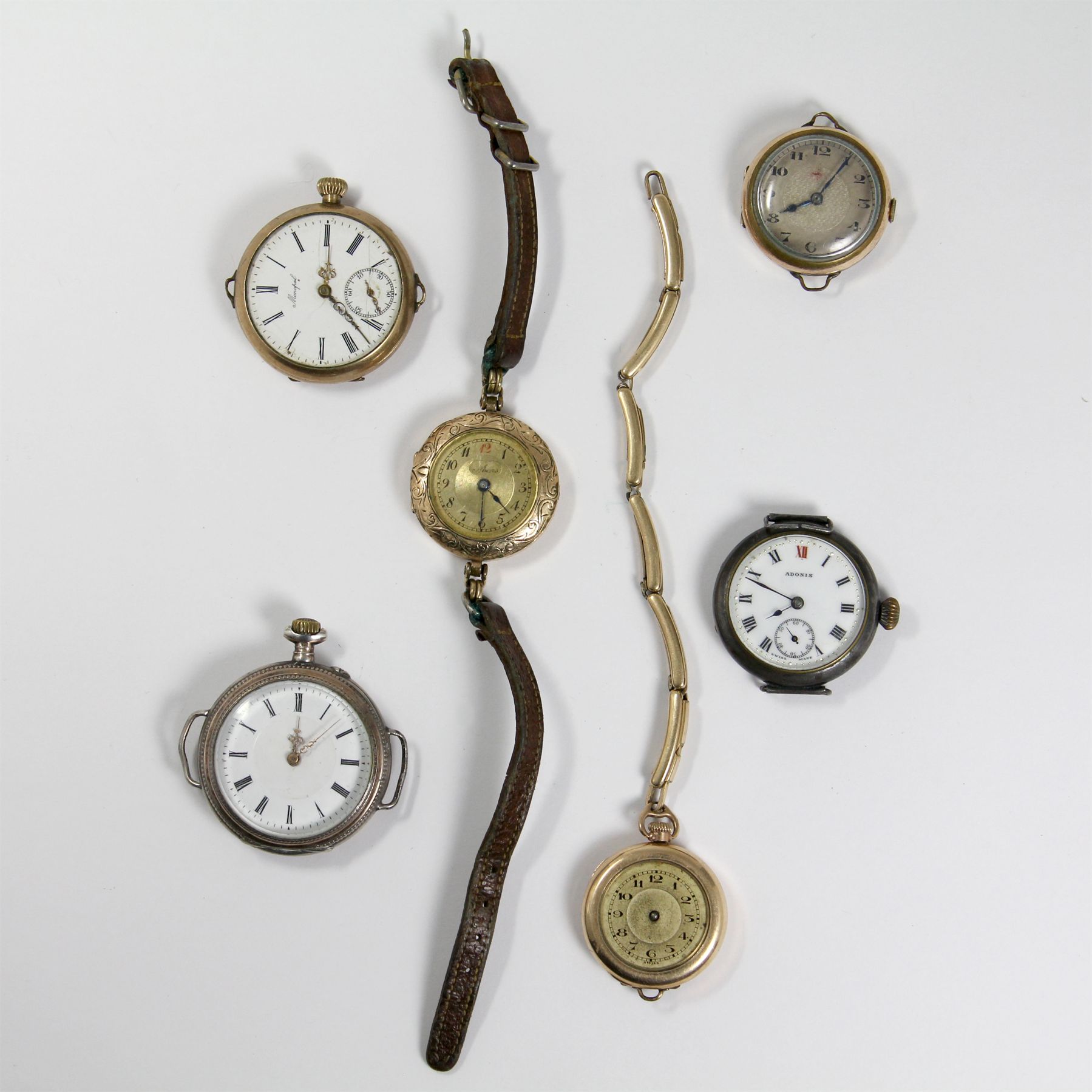 Six (6). Swiss. 1900s. Branded, "Monopal", "Adonis", (Red Cross), "Mars" and unbranded x 2. Cases: Gold filled, 0.800 silver and base metal. Marked, "0.800", "Fortune Gold Filled", "Cashier A.W.C Gold Filled Extra", "Fortune Gold Fille Case Made in Canada", "S.W.C. Co. 20 Years" and unmarked. 26mm-34mm case diameters. Two are running, 4 are not. One watch missing its crown and stem. Another is missing its crystal and hand set. Another is missing its crystal. Running watches have not been tested for timekeeping accuracy and may require adjustment. The fact that a watch has been described as "running" provides no guarantee of its ability to continue to do so.