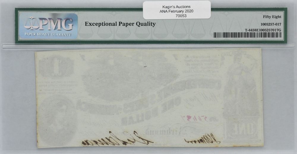T-41. 1862 $100. PMG About Unc 58 EPQ; T-44. 1862 $1. PMG Choice About Unc 58 EPQ.