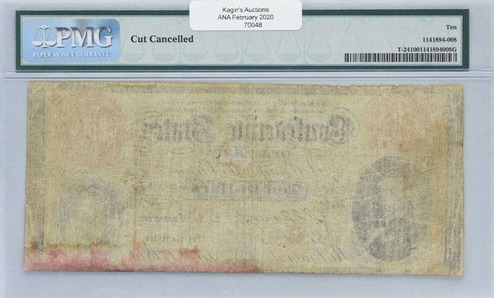 T-24. 1861 $10. PMG Very Good 10, Cut Cancelled; T-30. 1861 $10. PMG Very Fine 30.