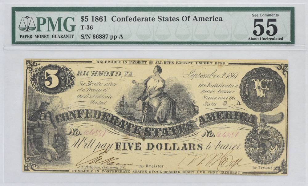 T-36. 1861 $5. PMG About Uncirculated 55 EPQ; T-40. 1862 $100. PMG About Uncirculated 55.