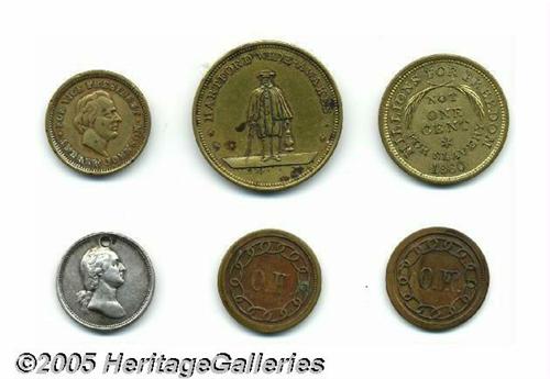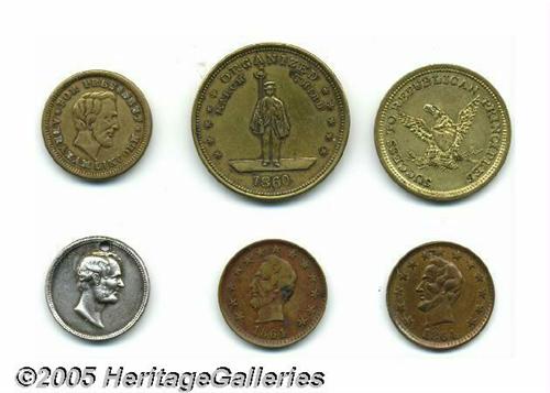 <B>Six Assorted Abraham Lincoln Tokens and Medals</B></I> This eclectic group contains two Lincoln tokens from 1860, three Lincoln Civil War/political tokens from 1864 and a Lincoln - Washington Mint medal. The specifics: Lincoln Wide Awakes medal in brass AL 1860-40 (28 mm, very fine with some scattered spots of corrosion, mostly on one side), AL 1860-59 in gilt brass (bright uncirculated, 24 mm), AL 1864-67 in copper (very fine, cleaned, 19 mm), AL 1864-56 in copper (very fine, 19 mm), a duplicate AL 1864-56 (fine with some spots of verdigris) and a holed silver mint Medal depicting Lincoln and Washington (very fine, 18 mm). A good starter set or dealer lot. Lot:257