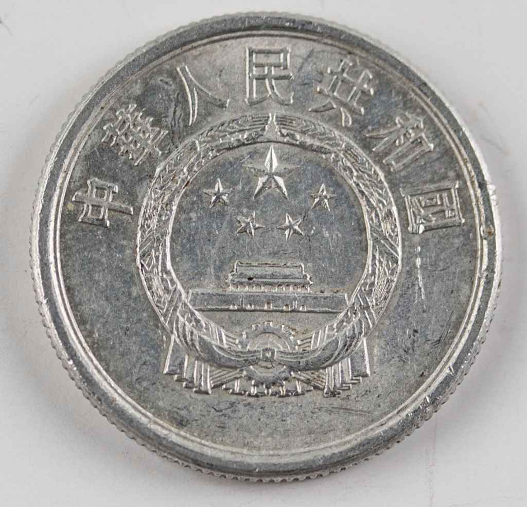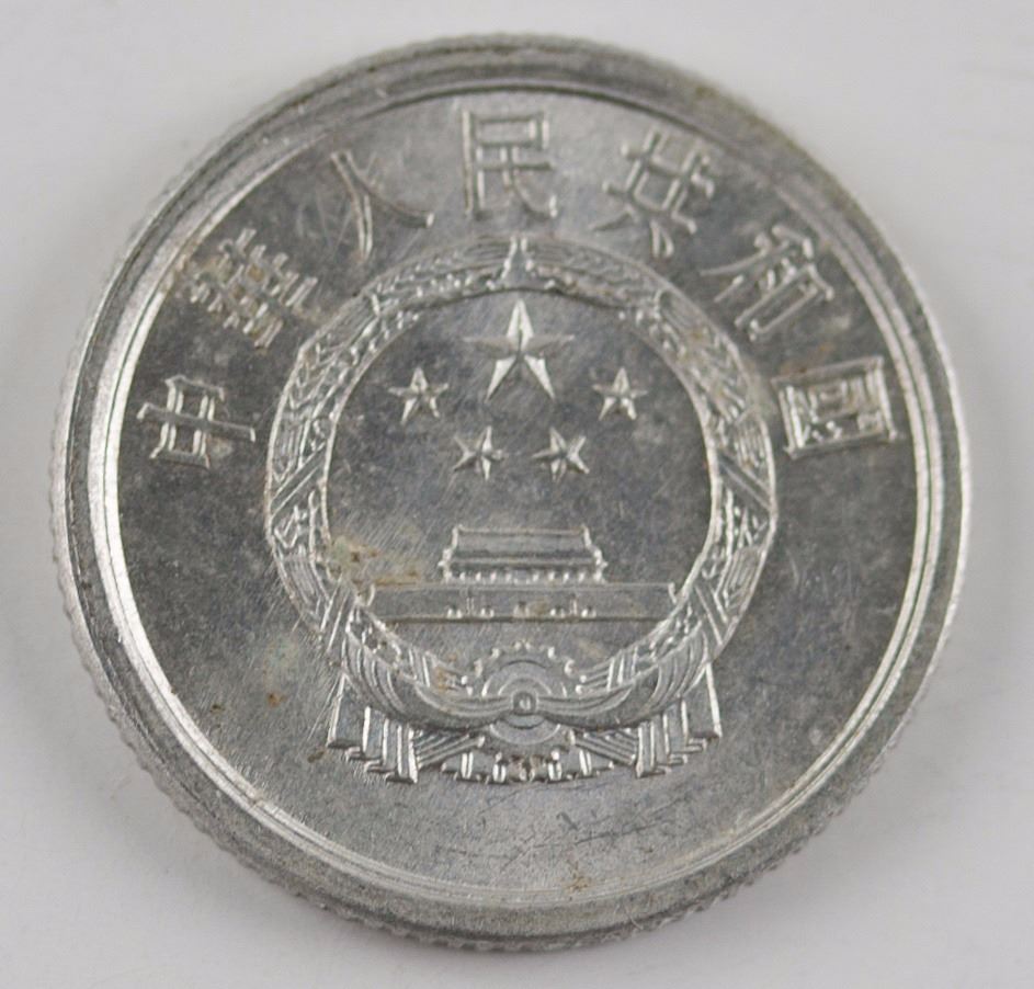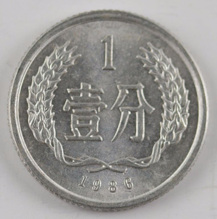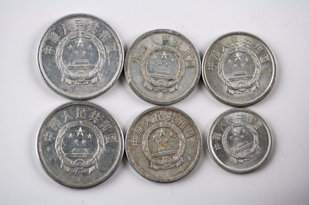 Six (6) assorted Chinese aluminum coins; include: 1 pc 1986 1 cent coin; 1 pc 1977 2 cent coin; 1 pc 1985 2 cent coin; 1 pc 1987 2 cent coin; 1 pc 1976 5 cent coin; 1 pc 1986 5 cent coin;
