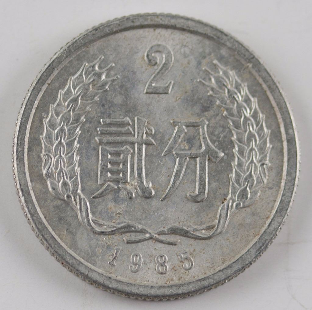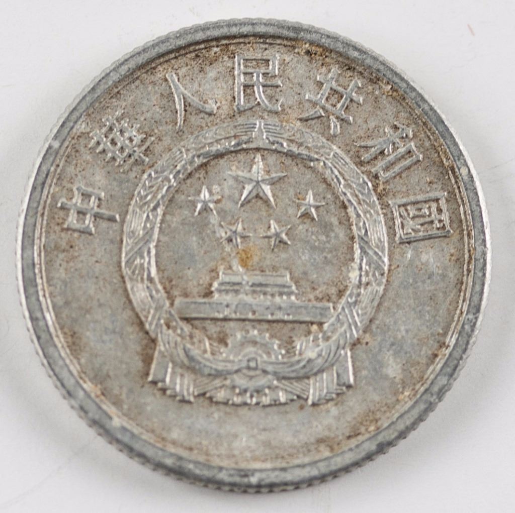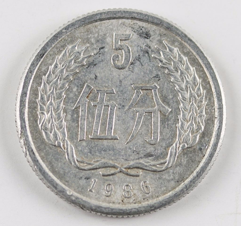 Six (6) assorted Chinese aluminum coins; include: 1 pc 1986 1 cent coin; 1 pc 1977 2 cent coin; 1 pc 1985 2 cent coin; 1 pc 1987 2 cent coin; 1 pc 1976 5 cent coin; 1 pc 1986 5 cent coin;