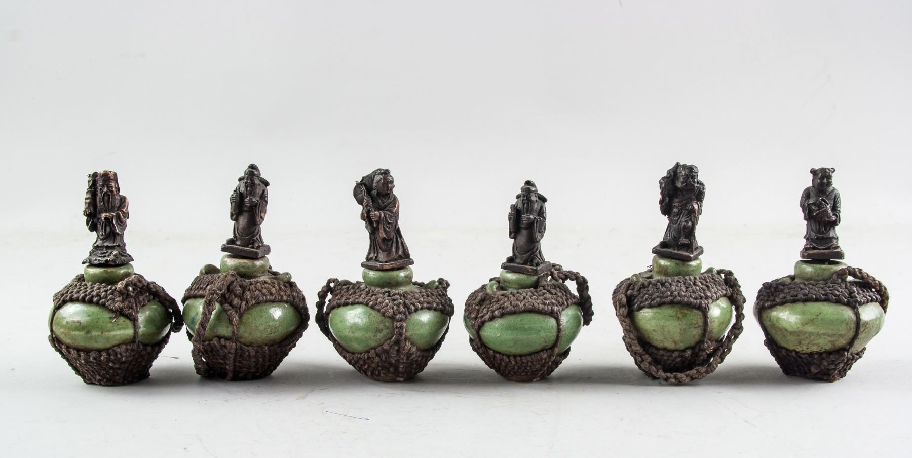 Six (6) assorted Chinese porcelain medicine pots, of compressed globular body, each lid carved with various deities, 11.5 x 6 cm, 1031 grams total