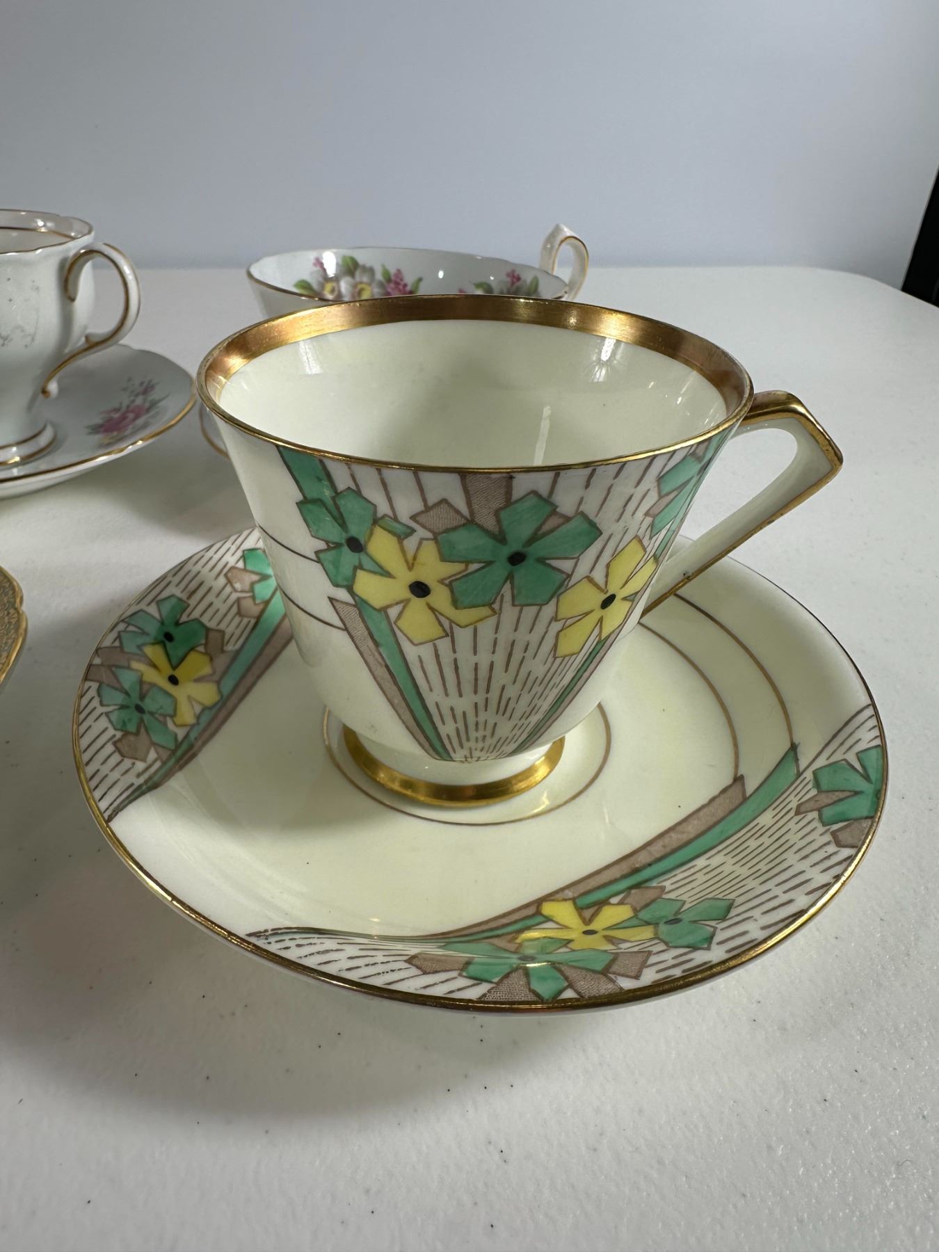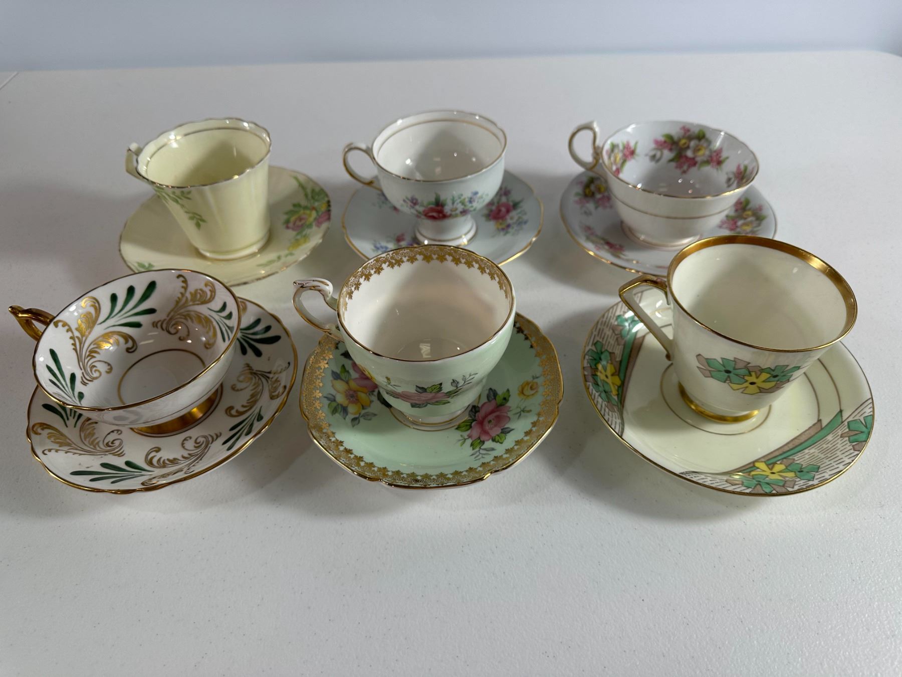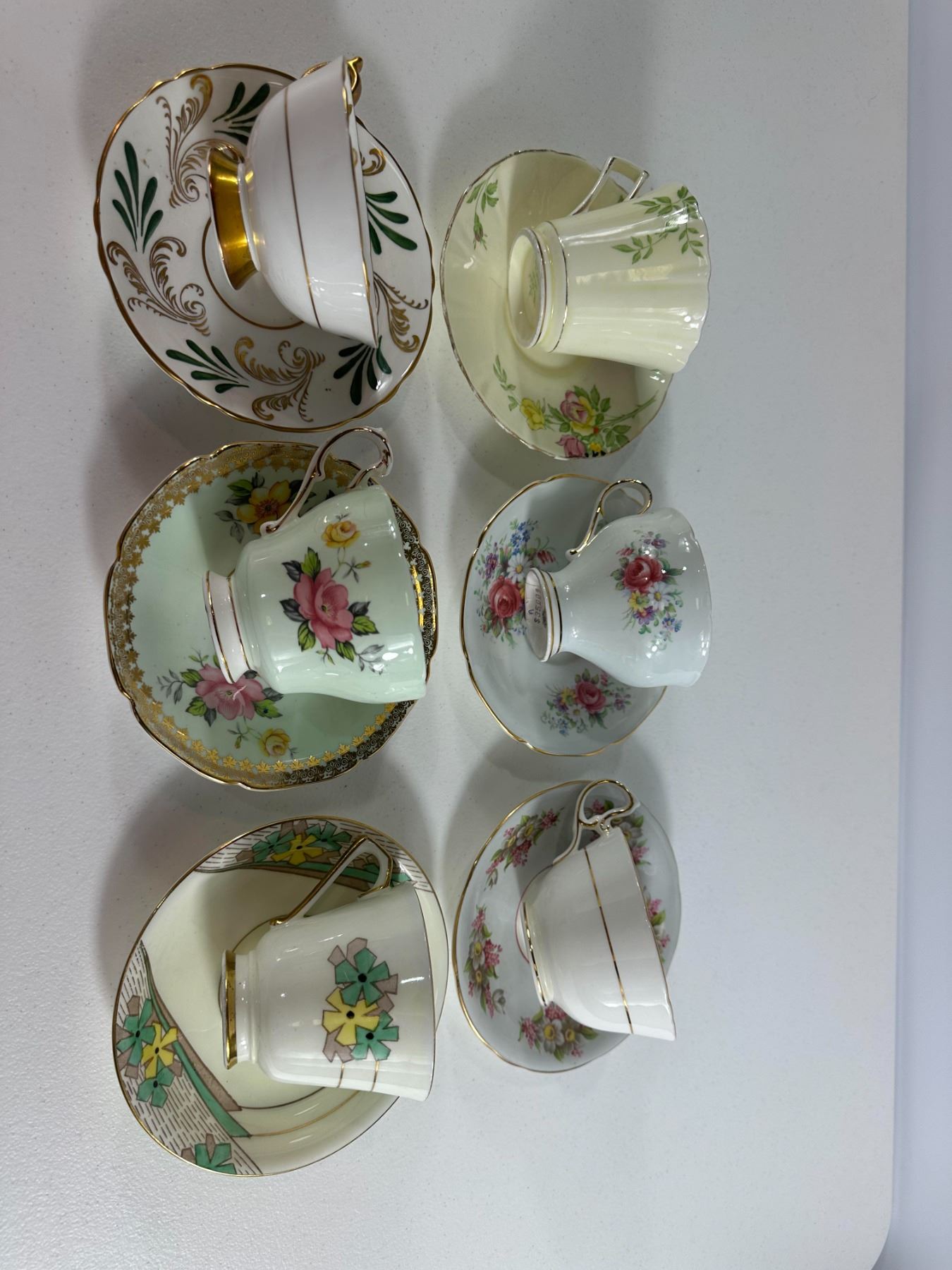 Another coordinated set of six duos including florals, mint ribbed, and gilt leaf patterns. Great for display or tea party sets; light wear.