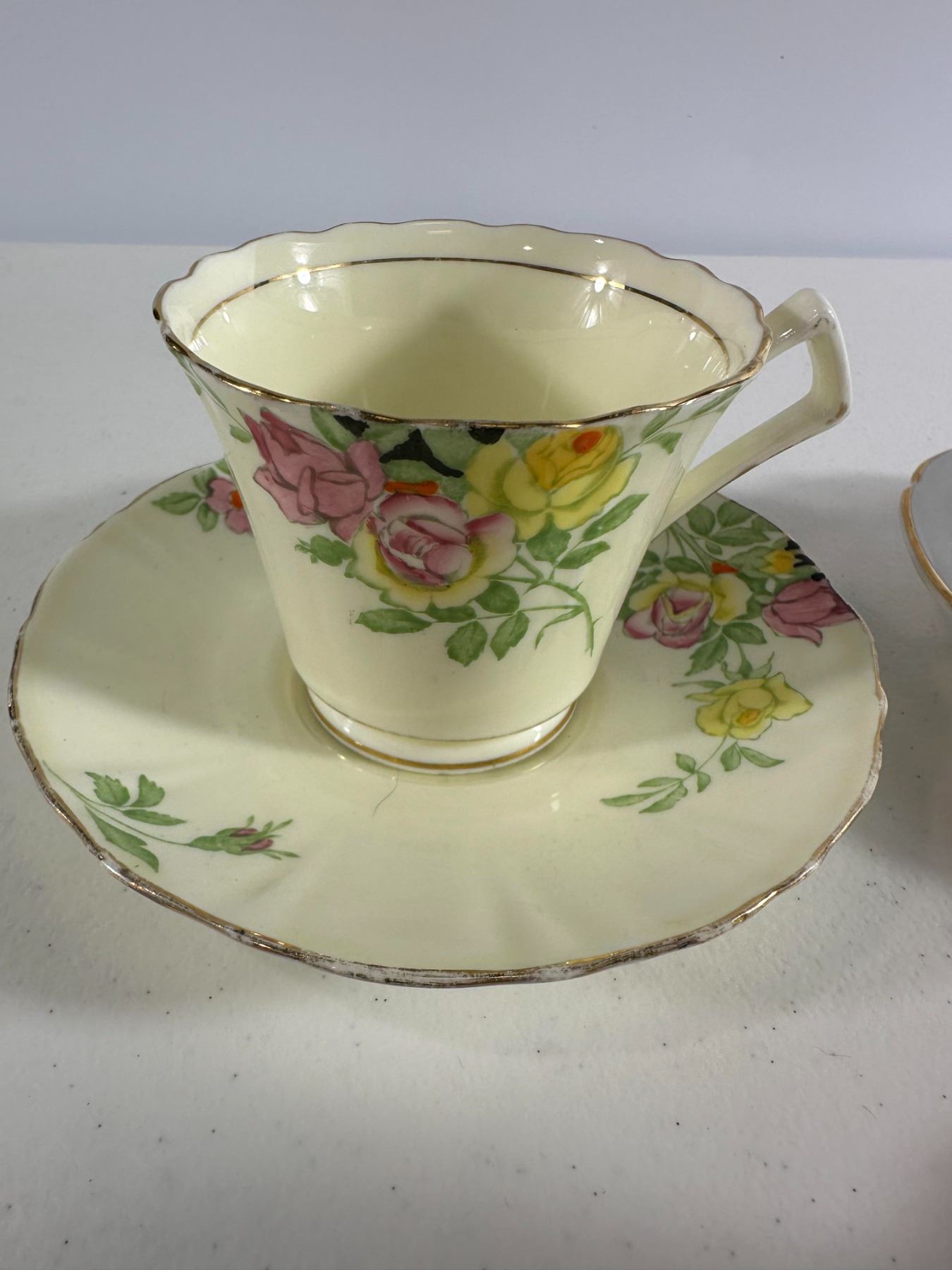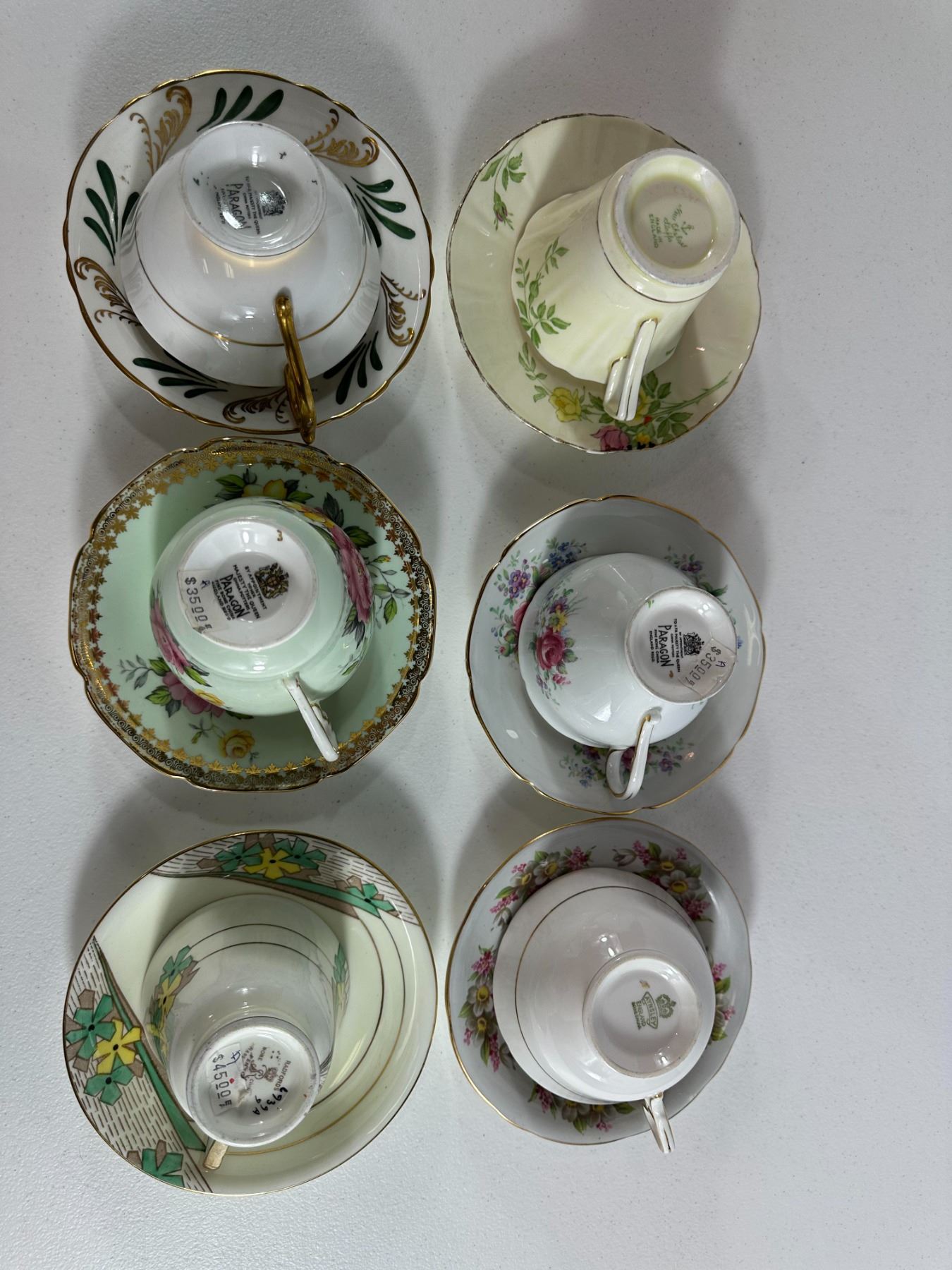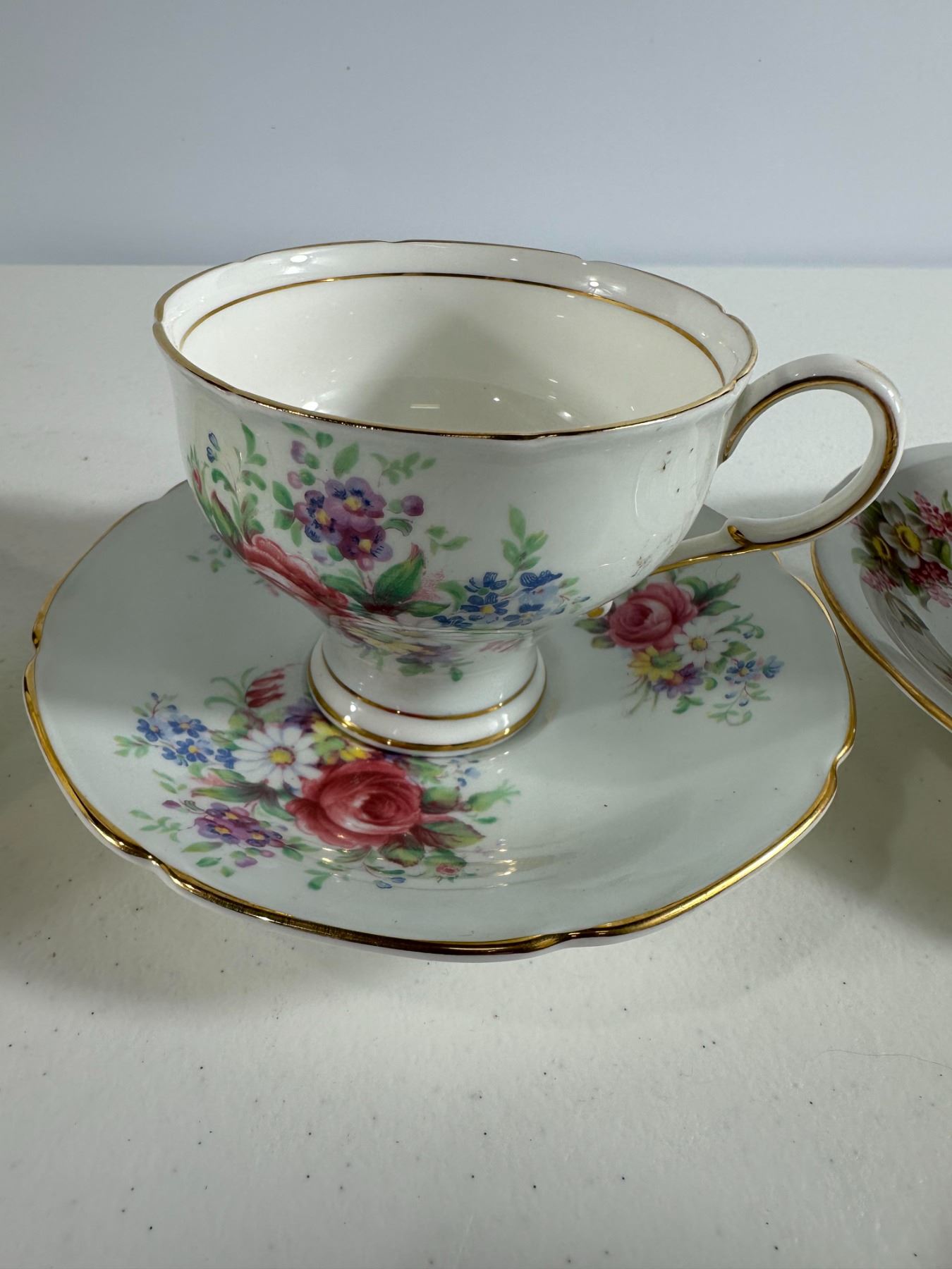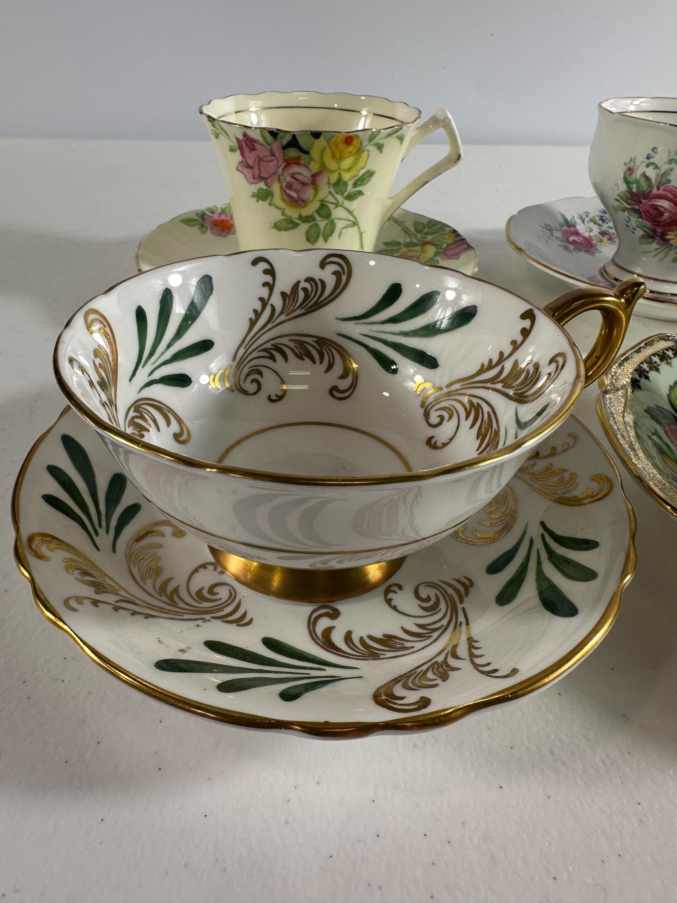 Another coordinated set of six duos including florals, mint ribbed, and gilt leaf patterns. Great for display or tea party sets; light wear.