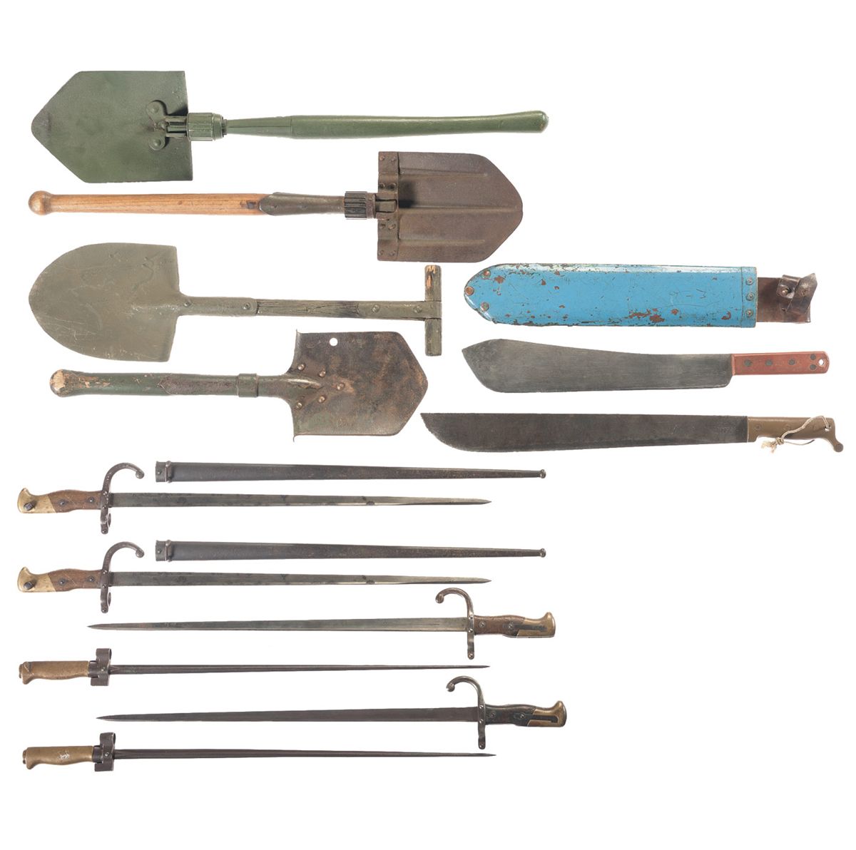 1 machete marked "True Temper/1945" and "U.S." with 1 broken grip, 1 machete marked "S&J Kitchin. LTD/Sheffield/No. 2640" and "1952" with fiberglass scabbard, two spike bayonets and 4 French model 1874 sword bayonets with 2 sheaths. 1 entrenching shovel marked 1940, 1 folding Swiss entrenching shovel, 1 U.S. marked entrenching shovel and 1 folding entrenching shovel.