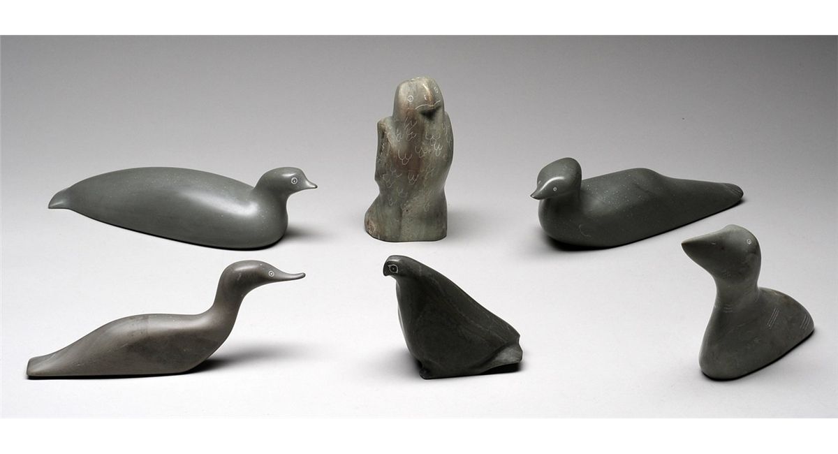 Six Bird Carvings by Various Sanikiluaq Artists Including Thomassie Kow Charlie 4 1/2" L. - 10" L. All in Good Condition
