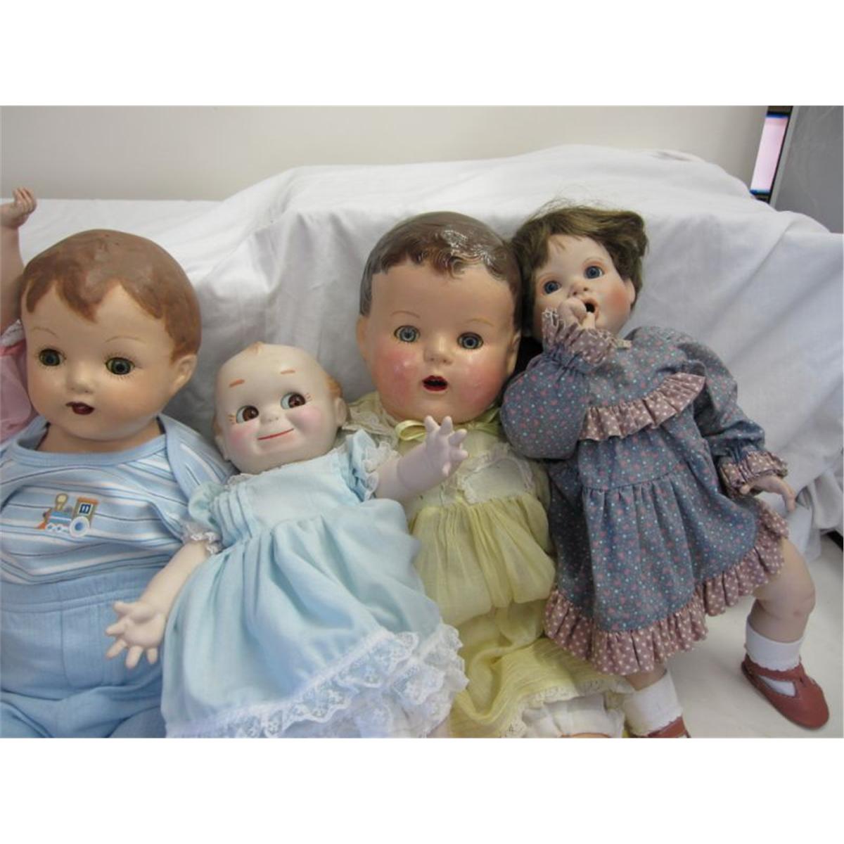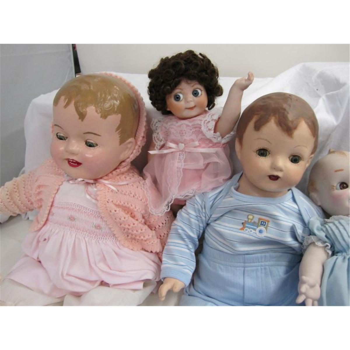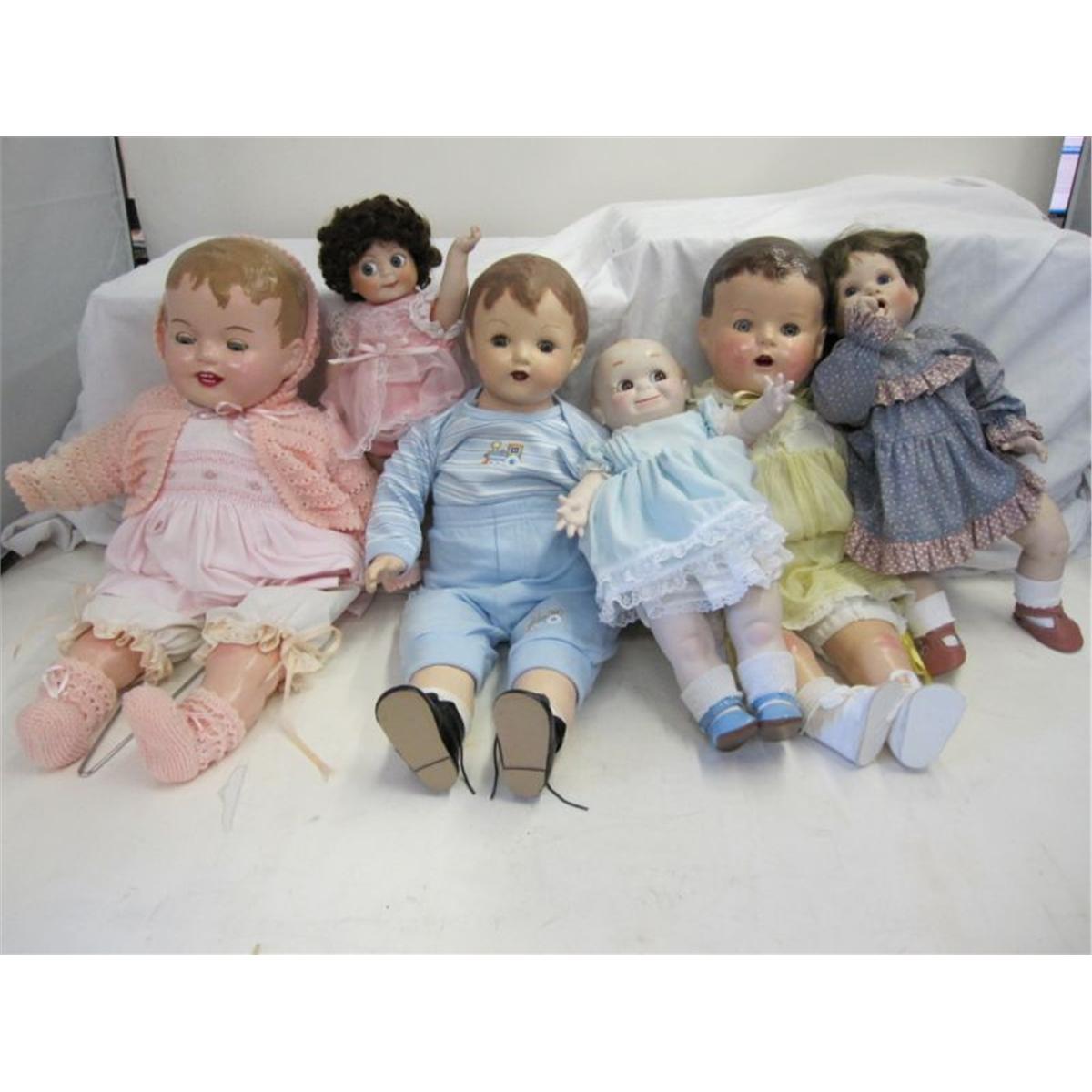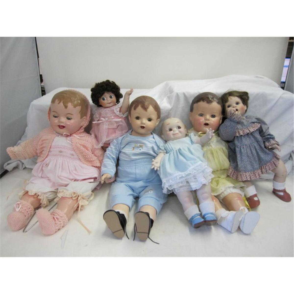 A set of six dolls, made of both Bisque and Composition materials. There are three of each type. All dolls come with clothing and are in good condition. Range in size.