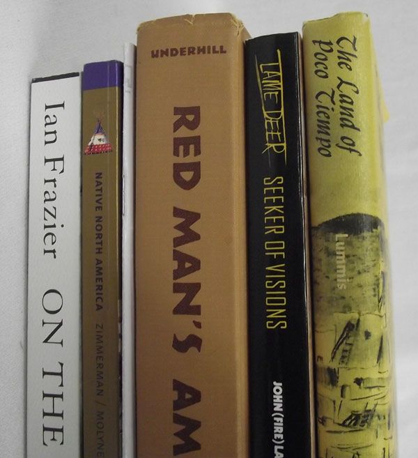 From the Nick and Susan Nicholas Collection, Six Books, Native American Interest. 1. ''The Land of Poco Tiempo'' by Charles F. Lummis, University of New Mexico Press, Copyright 1893, Fifth Printing 1973 hardback, dust jacket, 236 pgs. 2. ''Red Man's America'' ''A History of Indians in the United States'' by Ruth M. Underhill, illustrated by Marianne Stoller, published by The University of Chicago Press, Copyright 1953, 400 pages, clean, pencil notations inside front covers back and front, hardback. 3. ''Native North America'' by Larry J. Zimmerman and Brian Leigh Molyneaux, softback, Red River Books, University of Oklahoma Press, Norman, copyright 1996, 184 pgs., clean. 4. ''Lame Deer, Seeker of Visions, The Life of a Sioux Medicine Man by John Lame Deer and Richard Erdoes, Touchstone Book, Published by Simon & Schuster, copyright 1972, softback, 288 pgs, clean. 5. ''Two Voices'', A Collection of art and poetry'' by Irene E. Pena and Amado M. Pena, Jr. published by Kiva Publishing, Inc., copyright 2003, 16 pgs, clean. 6. ''On The Rez'' by Ian Frazier, published by Farrar, Straus & Giroux, New York, copyright 2000, softback, 312 pgs., clean. From the Nichols Collection.