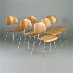 Six CHARLES EAMES for HERMAN MILLER DCM chairs with walnut finish on bright chrome tubular frame. Shallow scratched to back and seat of two, one loose back, one with recaulked mounts. Paper label. 29" x 19" x 21" $600 - 900