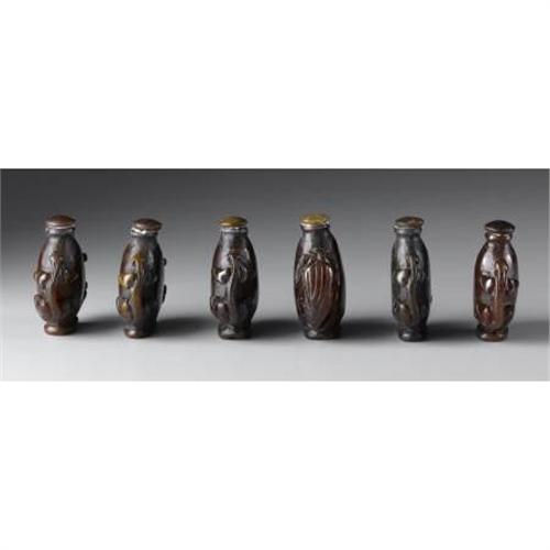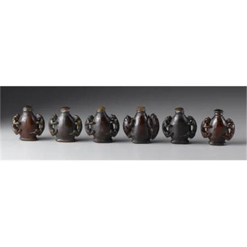 <B>Six Chinese Snuff Bottles<BR></B></I><BR>Six Chinese carved hardstone snuff bottles, each with double chilong handles<BR>2-1/4in. high<BR><BR> <B>Condition Report:</B> Normal signs of wear as appropriate with age.<BR><BR><b>Shipping:</b> Bottles, Jars & Containers (<a target="_blank" href="http://www.heritageauctions.com/common/shipping.php">view shipping information</a>)