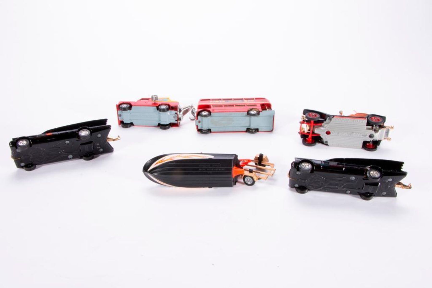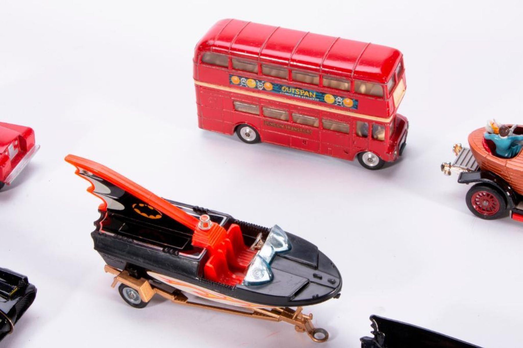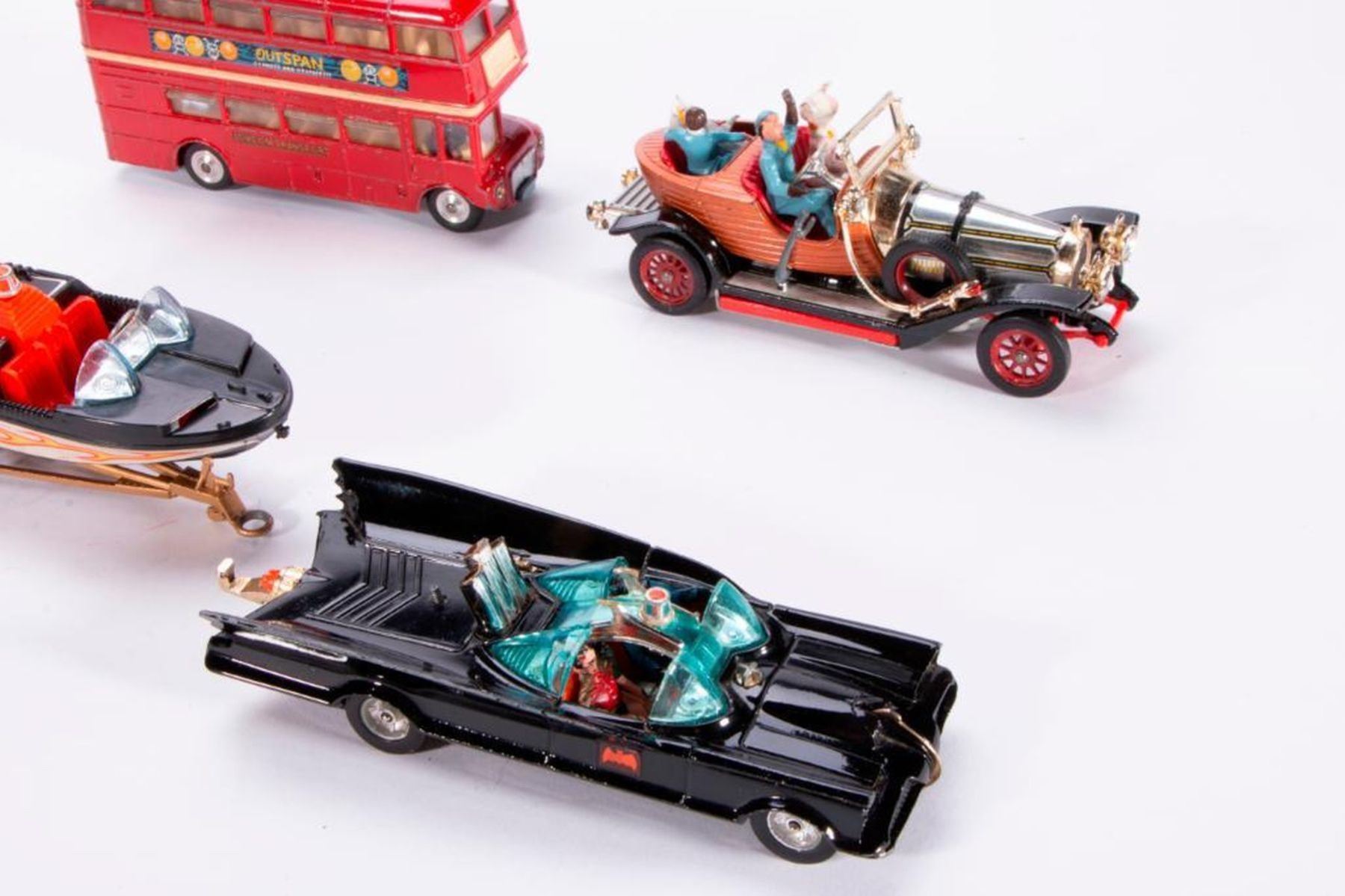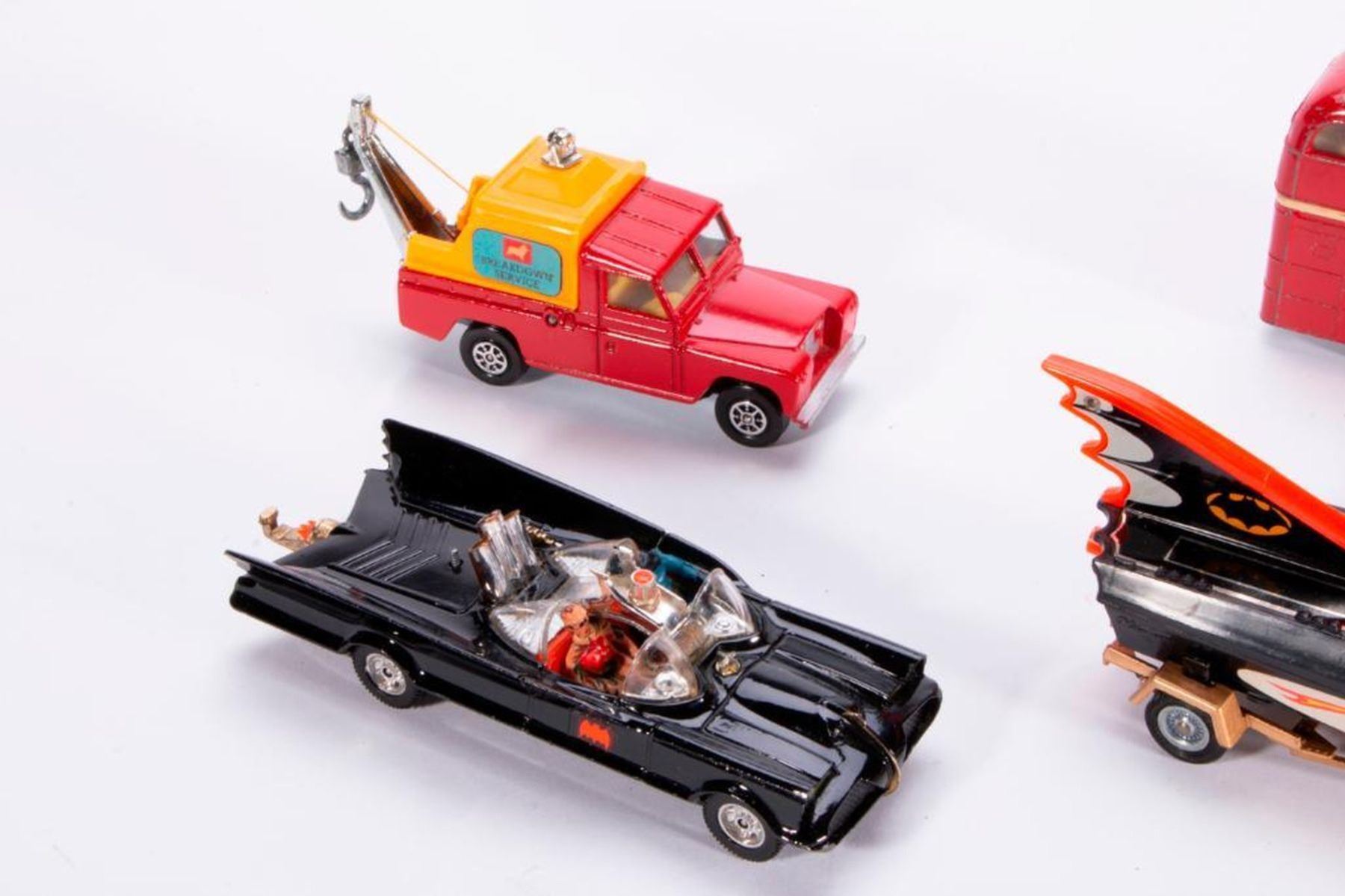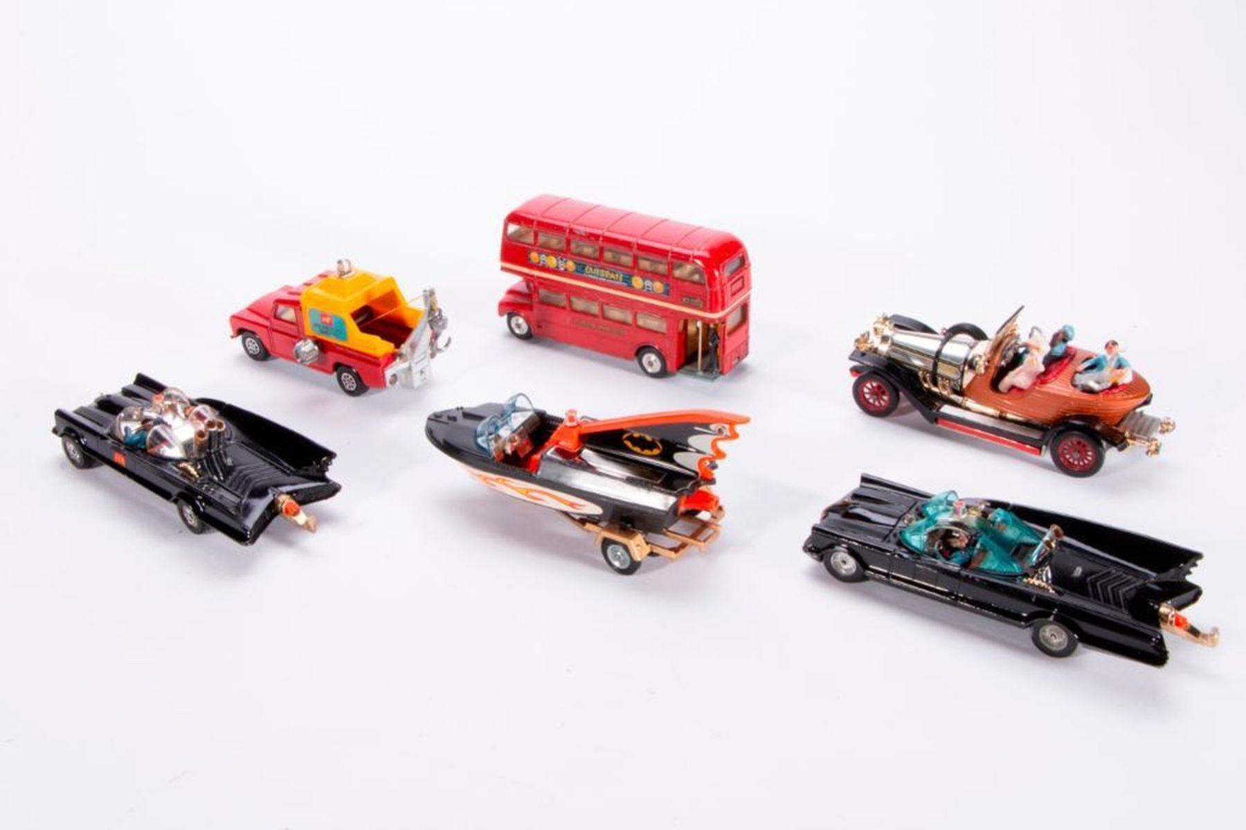 Six unusual Corgi model toys including Bat mobiles, Bat boat, Chitty Chitty Bang Bang, etc. largest measuring 2 1/2 inches high x 4 1/2 x 1 1/4. Items are sold as is. Please inquire about condition if not otherwise stated.