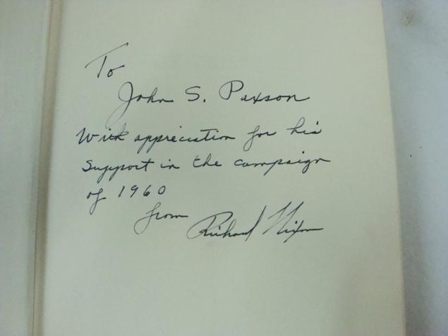 Ist Edition, 1st printing of this famous book. Signed by Richard Nixon to a dedicated volunteer that worked on the 1960 campaign. Some yellowing of the tape that holds the dust jacket onto the book. Seldom seen signed copy.