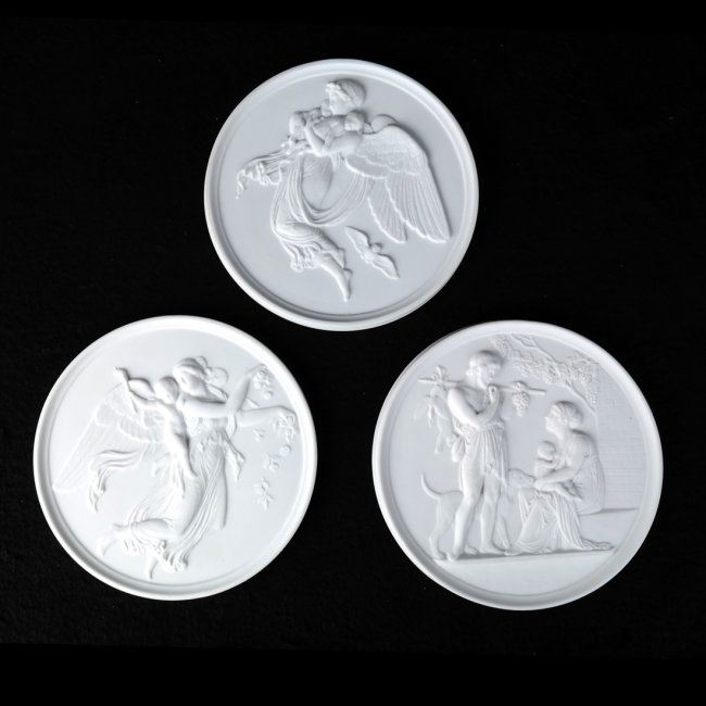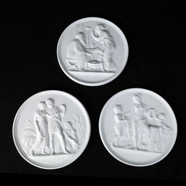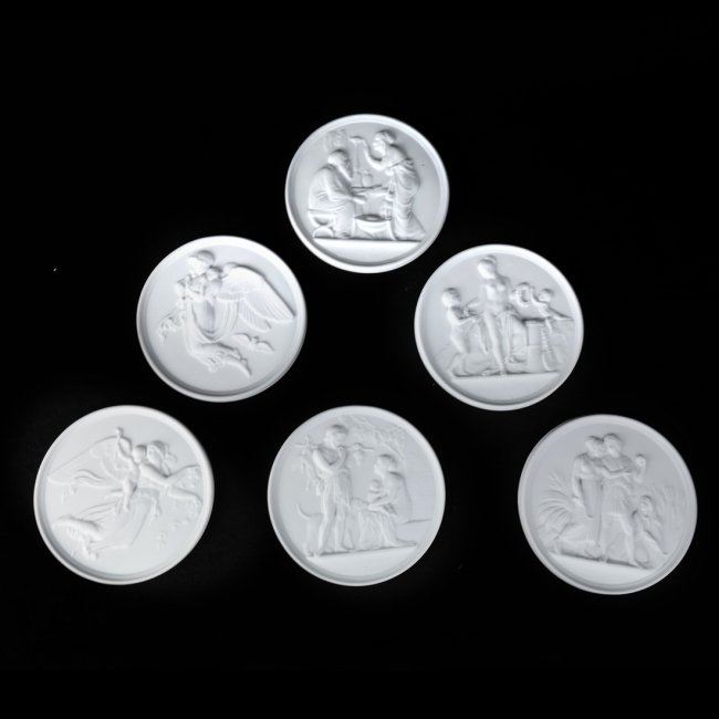 Comprises series of six decorative porcelain plaques depicting classical scenes. [5 3/4" Dia]. In good condition.