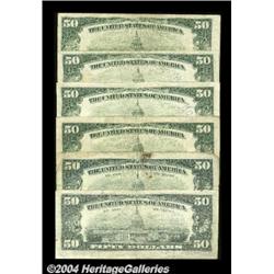 Six Different Hard-to-Find $50 Feds.Fr. 2108-B $50 1950A Federal Reserve Note Fine-VFFr. 2108-E $50 1950A Federal Reserve Note Fine-VFFr. 2109-G $50 1950B Federal Reserve Note VF-XFFr. 2110-A $50 1950C Federal Reserve Note Fine-VFFr. 2113-E $50 1963A Federal Reserve Note VGFr. 212121-D $50 1981A Federal Reserve Note VF, small teller stamp 6 notes <BR><BR><B>Important notice:</B> Heritage usually auctions material at the rate of 200-250 lots per hour. On some occasions eBay Live bid software or the Internet may not be able to keep up with the pace of the auction. We recommend placing a realistic absentee bid now as insurance to avoid disappointment. Occasionally the auctioneer may eliminate or reject an eBay Live bid, and the auctioneer may also reopen a lot after the close of the eBay live bidding (usually because we missed an audience bid), and may reject your bid even if it shows you as the winning bidder. By bidding via eBay Live, you agree that Heritage may award the lot to another bidder at its sole discretion under the circumstances described above or any other reasonable circumstances. Since eBay bids are not shown to us until we open the lot on the floor, we treat those bids just like floor bids. In most cases the floor responds before the eBay bid is presented to us, due to Internet lag time, so for consistency we have made it a policy that floor bids are always considered first over tie eBay live bids. Also please note that all Heritage lots purchased through eBay Live carry a 20% Buyer's Premium. Please make sure you read the Terms and Conditions before you bid. <BR><BR><B>IMPORTANT ANNOUNCEMENT ABOUT RESERVES:</B> Heritage now divulges all reserves on its web site 7 days before every auction. If you want to know whether the reserve on this lot has been met, and if not, what the reserve amount is, please visit this lot page on the HeritageCoin.com web site, or email: bid@HeritageGalleries.com