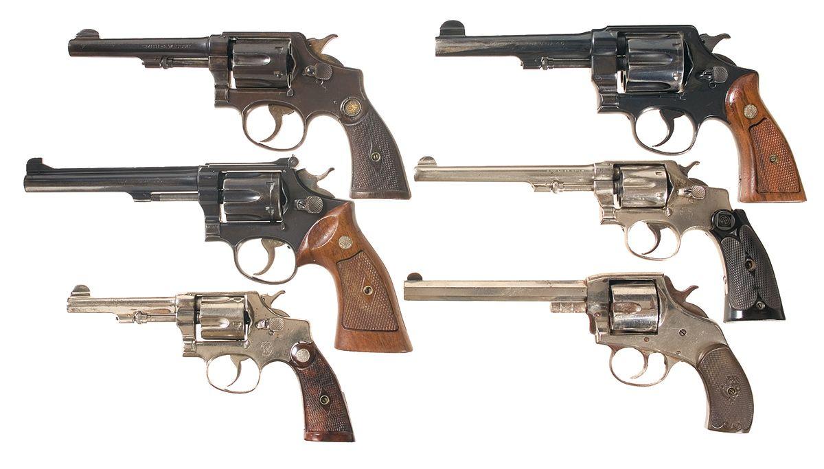 C) Made before 1956. Ramp Patridge and adjustable notch sights, 5-screw frame, pinned barrel, counterbored cylinder, and checkered wraparound grips.