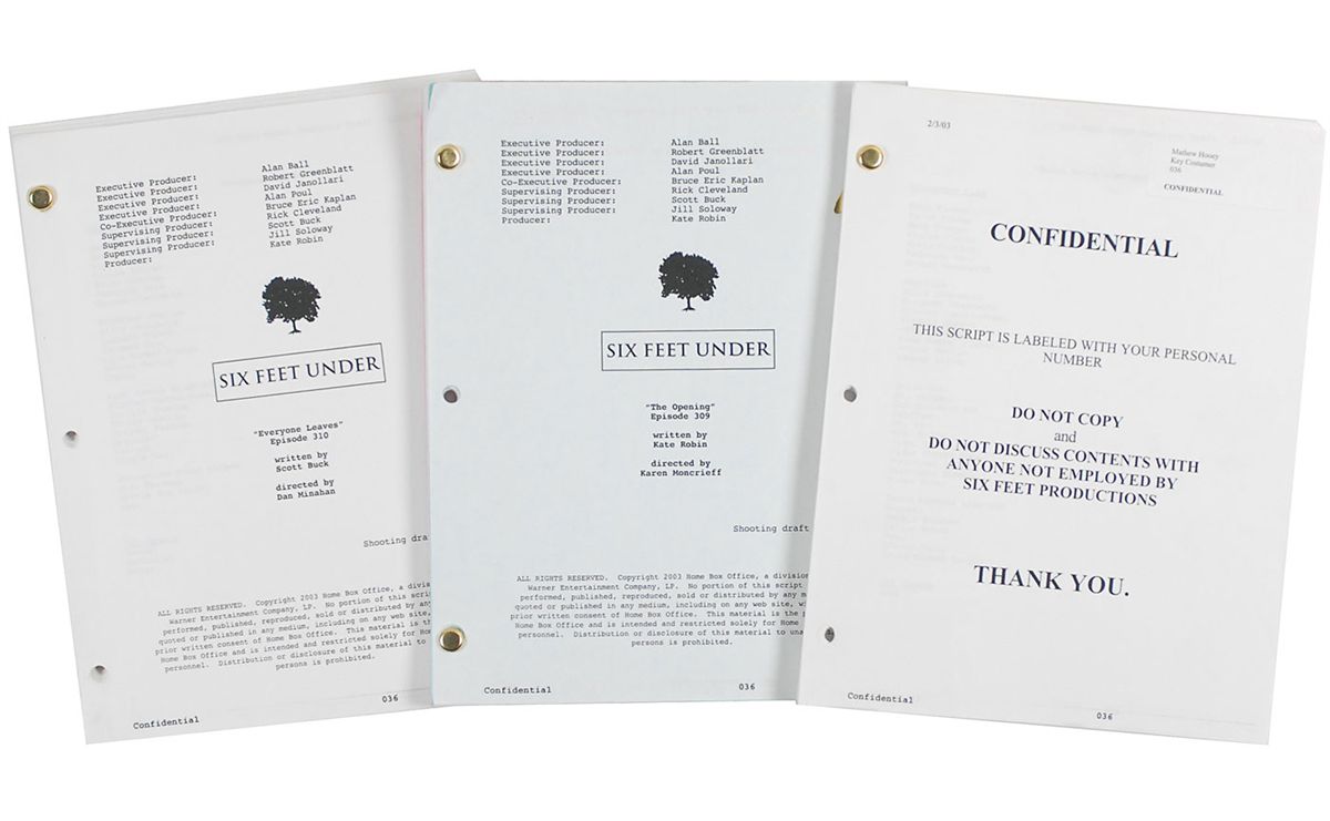 Three shooting draft scripts from HBO’s series Six Feet Under. Brad-bound scripts are for the episodes entitled “The Opening,” “Everyone Leaves,“ and “Death Works Overtime.” The script for “Death Works Overtime,” has a label on the front indicating the script was issued to key costumer Mathew Hooey, as well as a printed warning which reads, “Do not copy and do not discuss contents with anyone not employed by Six Feet Under Productions.” In fine condition.