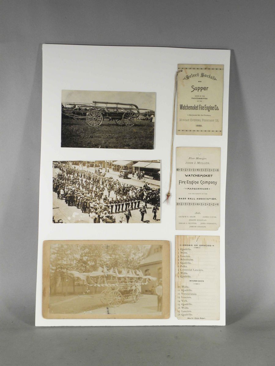 Lot of Six Firemen Related items including three early photographs and three Watchemoket Fire Engine Dance Cards. Various sizes and conditions.