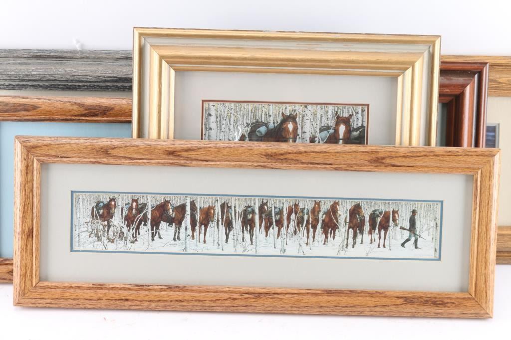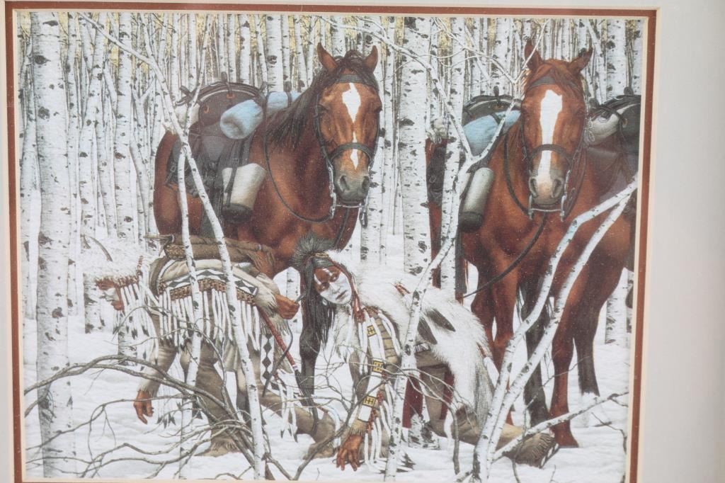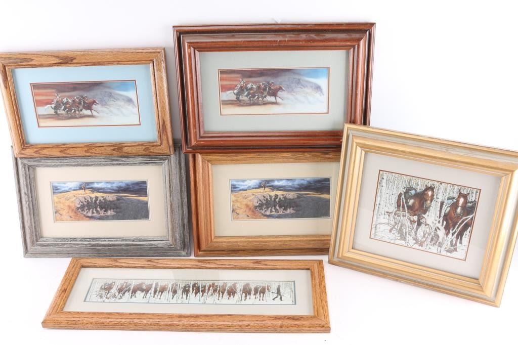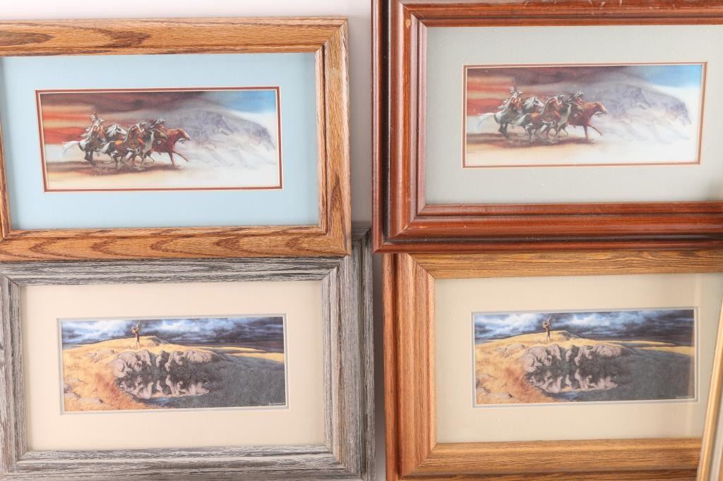 (1) "Two Indian Horses", nicely matted and wood framed, measures 20 1/2" by 7 1/4" with frame. (1) "Two Indian Horses" Detail, nicely matted and blonde wood framed, measures 13 1/2" by 12".(2) "Wolves of the Crow", nicely matted and framed, measuring 14 3/4" x 10" and 13" x 8 1/2".(2) " Calling of the Buffalo", nicely matted and framed, measuring 14 3/4" x 10" each.