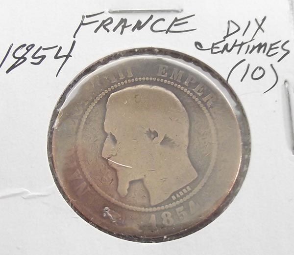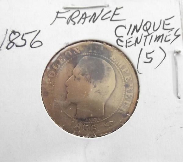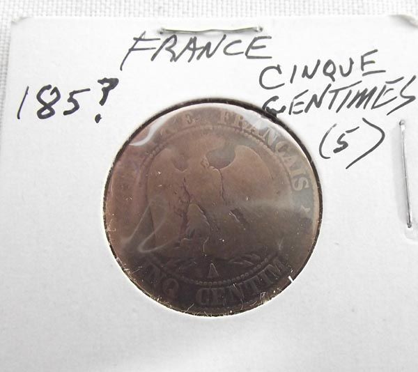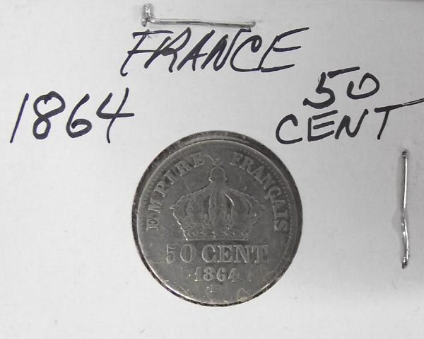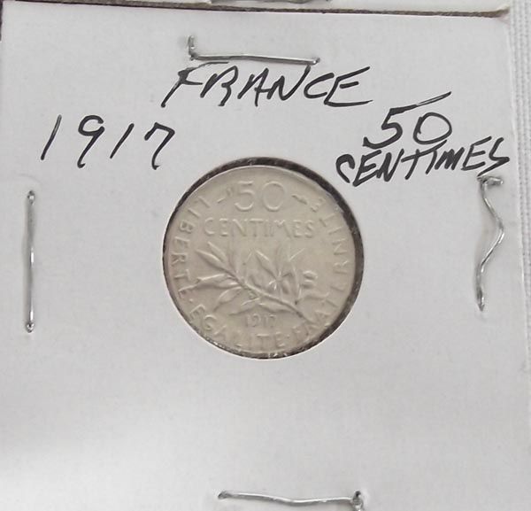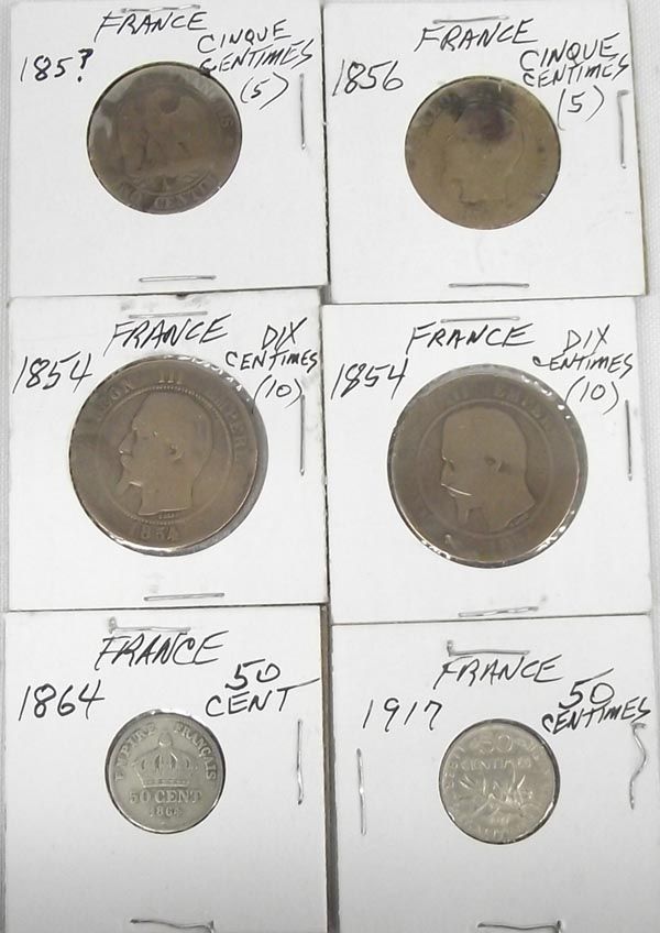 Six French Coins. Two 50 centimes coins, Two 10 centimes coins, Two 5 centimes coins.