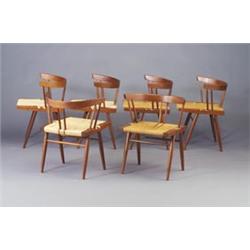 Six GEORGE NAKASHIMA grass seated barrell chairs. Three chairs possibly reseated, minor stain to one seat. Unmarked. 28 1/2" x 23" x 18" $3,000 - 4,000