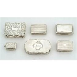 Six George IV and later vinaigrettes each with a foliate pierced grille, comprising; one plain, Birmingham 1821 by Ledsam & Vale, 3.75cm (1.5 in), one engine turned, 1834 by Joseph Willmore, 3cm (1.25 in), one reeded with a foliate chased thumb-piece, 1834 by Gervase Wheeler, 3.25 cm (1.25 in), one of shaped outline and engraved with foliate scrolls, 1844 by Edward Smith, 4.25cm (1.75 in), one shaped oblong with a chased thumb-piece, engine turned and engraved with a flower and scroll cartouche with monogram, 1856 by Owen & Boon, 5cm (2 in), and a small foliate engraved vinaigrette, 1871 by R Thornton, 2cm (0.75 in)
