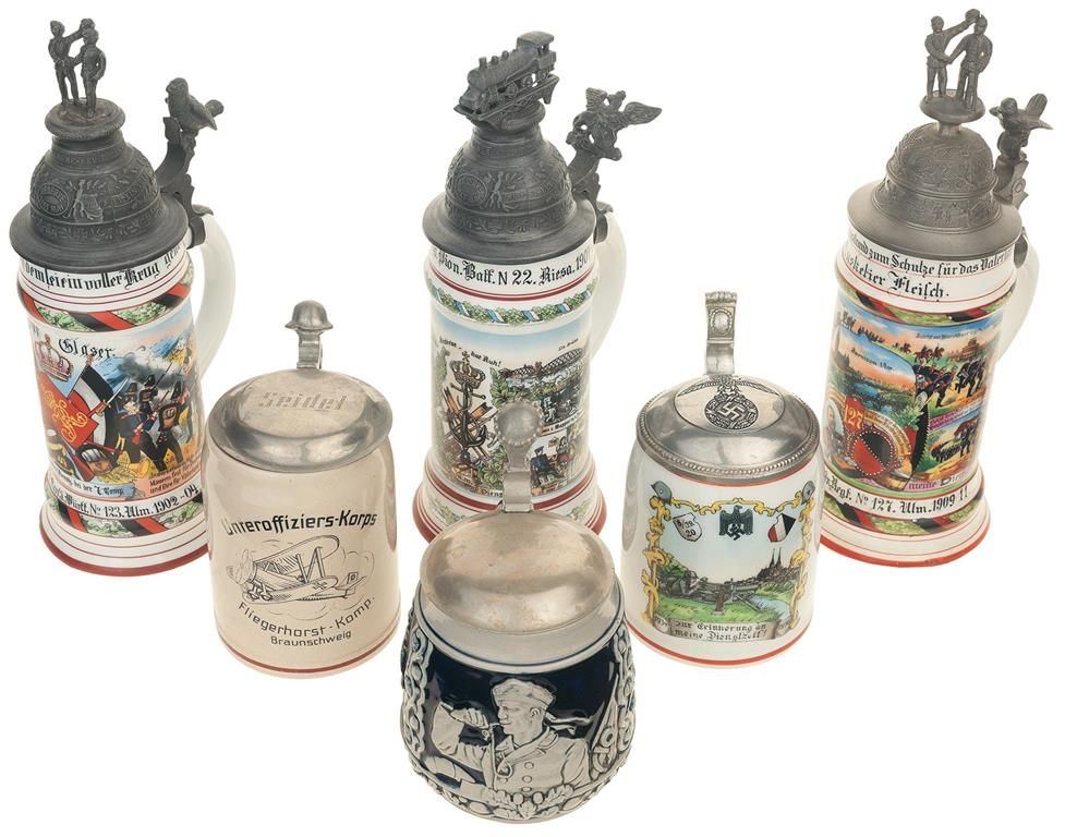 1) Porcelain stein with Imperial Train Engineer decoration, 11 inches tall with train ornament-topped pewter lid. Dated 1907-1909, with polychrome scenes of field engineers building a temporary pontoon bridge and a scene of a soldier courting in the bottom. 2) Porcelain stein with Imperial Grenadier decoration, dated 1902-1904, 11 1/4 inches tall with figural pewter lid, scenes of grenadiers at rest and at war, and a courtship scene in the bottom. 3) Imperial Musketeer-themed porcelain stein, 1909-1911 dated, 11 1/2 inches tall with figural pewter lid, polychrome scenes of soldiers at war and making passes at barmaids, and a courtship scene in the bottom. 4) Half-liter stone wear stein decorated to the NCO corps at Braunschweig, 6 inches tall with "Seidel" engraved on the pewter lid and a scene of an biplane in flight bearing iron crosses and swastikas on the side. 5) Half-liter stone wear stein with machine-gunner decoration, 6 inches tall with a Nazi eagle-engraved lid, 1934-1936 dates, and a polychrome scene of a machine gun operator. 6) Half-liter stone wear stein with naval-themed decoration, 6 1/4 inches tall with pewter lid, stamped "15/5507" and "WEKARA" on the underside.