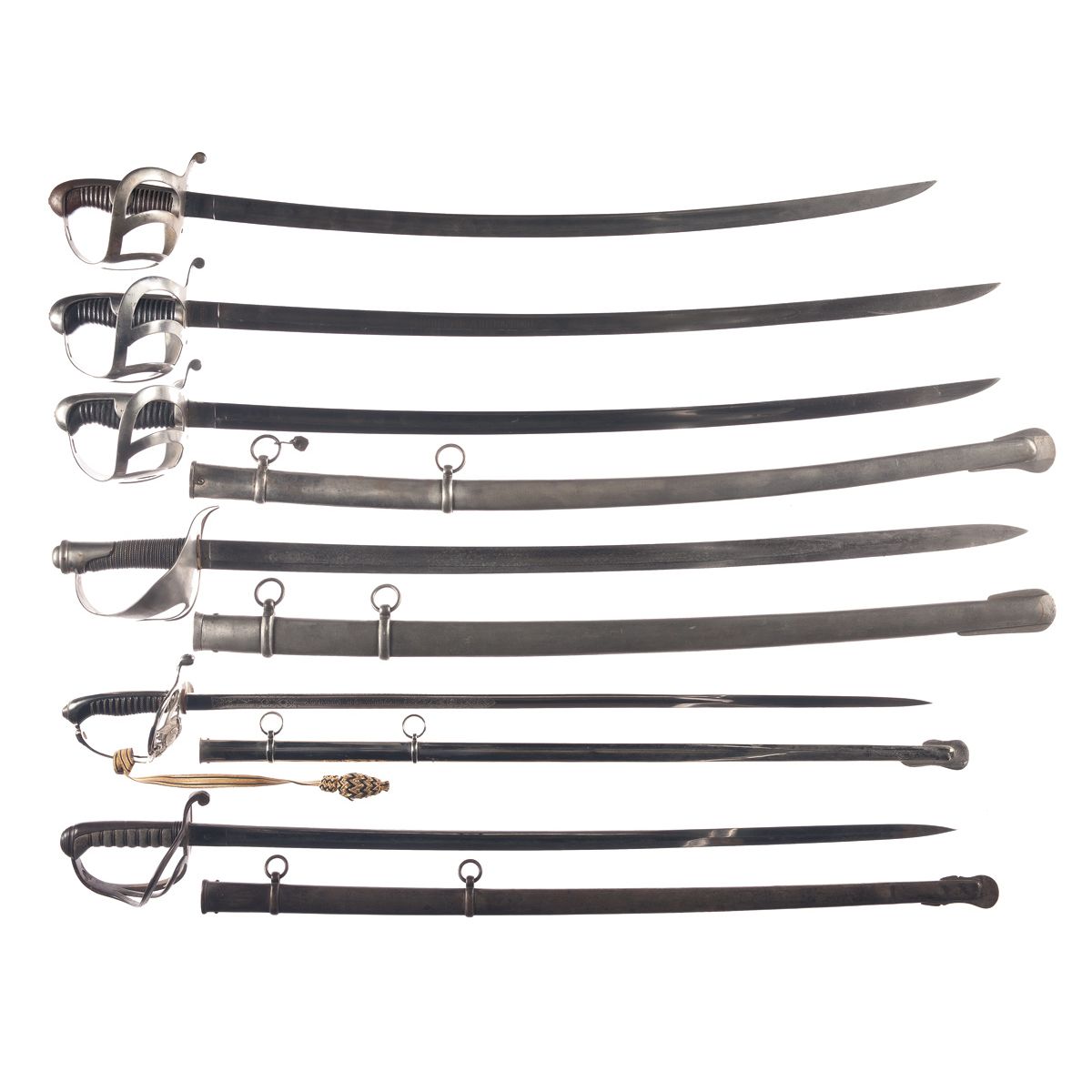 1) W. Kirschbaum sword, 32" blade, iron guard, wood grip. Fair. 2) As 1, 34 3/4" "EJERCITO ARGENTINO" etched blade, leather covered grip. 3) As 1, 34 3/4" blade, leather grip, "C/3" and "1279" on guard, metal sheath. Good, polished. 4) "S&K" sword, 35 1/2" blade, leather and wire grip, metal scabbard. Fair. 5) Kieffe sword, 32" "POLICIA DEL ECUADOR" etched blade, wire and celluloid grips, gold/ black sword knot and nickel finished sheath. 6) W. Walscheid sword, 33" blade, gold proof stamp, sharkskin grip and metal scabbard. Fair.