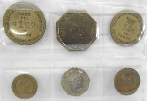 Six Indian Trade Tokens, #1 Front: San Carlos Trading Enterprise San Carlos, Arizona Good for $1.00 in trade, Back: 1.00 in Trade #2 Front: Indian Wells Trading Post Indian Wells, Arizona, Back: Good for 50 in trade #3 Front: San Carlos Trading Enterprise San Carlos, Arizona Good for 50 cents, Back: 50 cents in trade #4 San Carlos Trading Enterprise San Carlos, Arizona Good for 5 cents in trade, Back: 5 cents in trade #5 Teofilo Martinez Rose, N. Mex., Back: Good for 1 Fleece #6 Front: San Carlos Trading Enterprise San Carlos, Arizona Good for 10 cents in trade, Back: 10 cents in trade