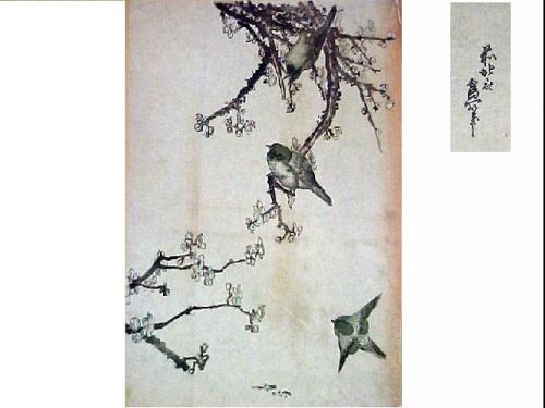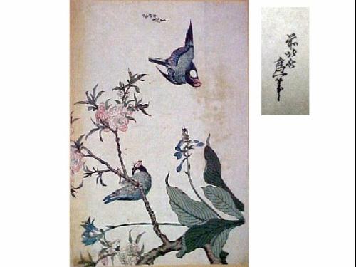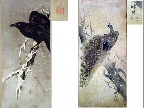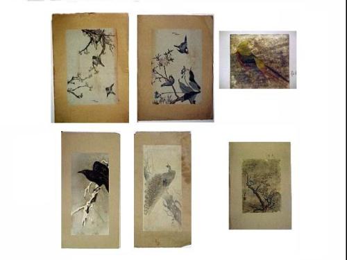 Six Japanese wood block prints; each artist signed; including two crows in winter snow 14 1/2" x 6 3/4" signed Sogan ; landscape with man in tree 9 1/4" x 6 3/4" by Shonen; peacock in tree 15 1/4" x 6 3/4" signed Sogan; bird of paradise 9 1/2" x 9 3/4" si
