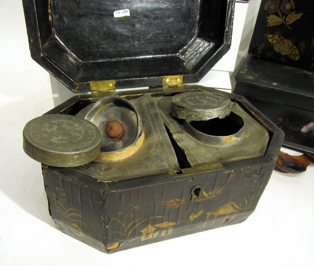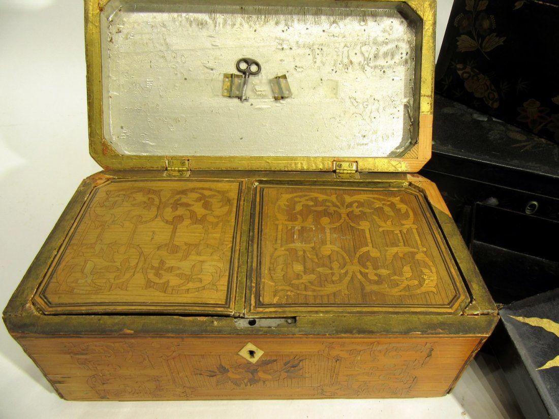 Some with damage as seen. One a continental inlay tea caddy, in poor condition.